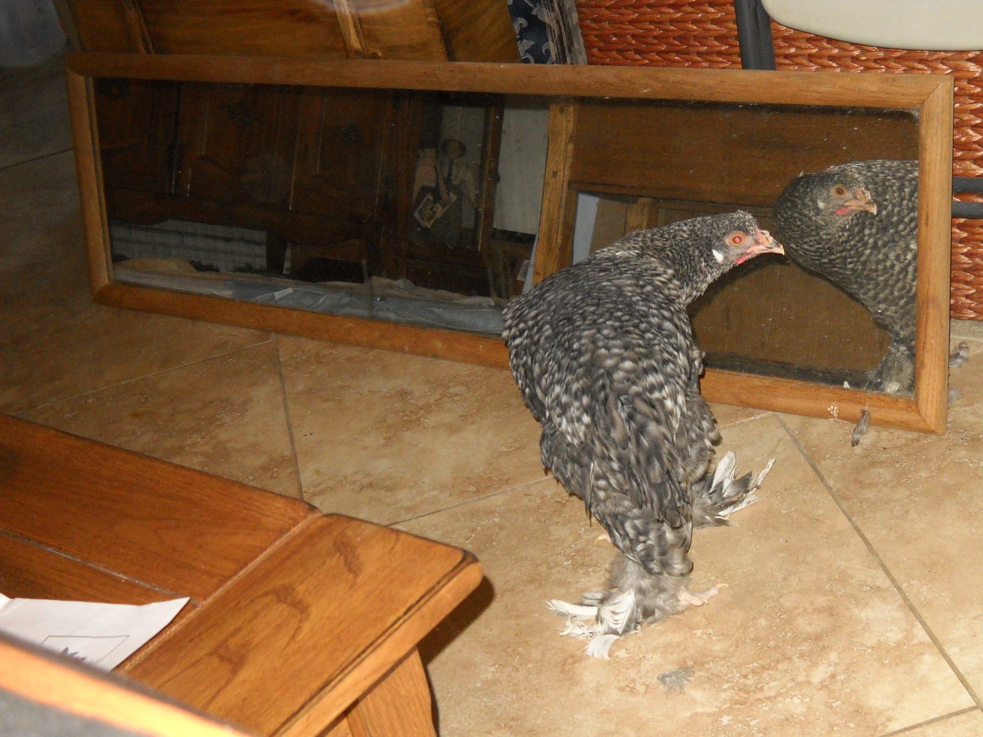 We once raised a single baby chick indoors but babies are too needy and cry all the time if they aren't following you around the house all day long. Two chicks would be better in a brooder but we can't use extra chicks so we only get older juveniles now. We use a door mirror to keep a single chicken occupied w/ her own reflection to talk to herself and sleep next to her reflection.