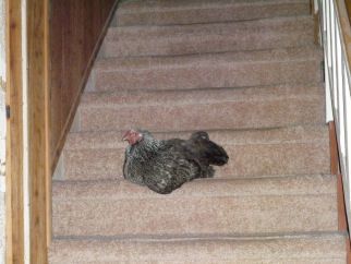 Frack, our "house chicken" comes and goes as she pleases. She will peck on the front door when she wants to come in and stand at the front door cackling when she wants to go back out. She will come in and lay her egg in her nest, then hang around a while, but then want to go back out. If the roosters irritate her too much, she will come back in for a while. Sometimes she comes in overnight, usually when it's raining out, and sometimes she will sleep with the rest of the flock. Of course, at breakfast and dinnertime, she's always at the door. She begs worse than a dog!