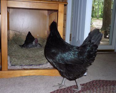 Blackie is the only other hen that comes inside to lay her eggs. She only visits for a little while and then goes back outside.