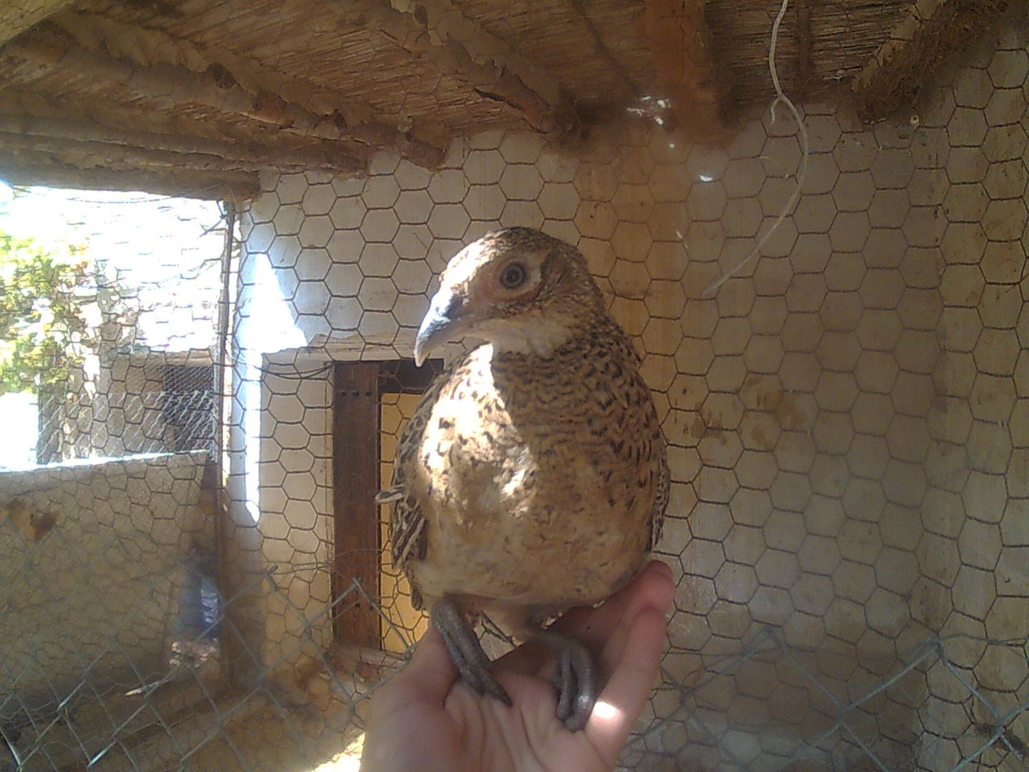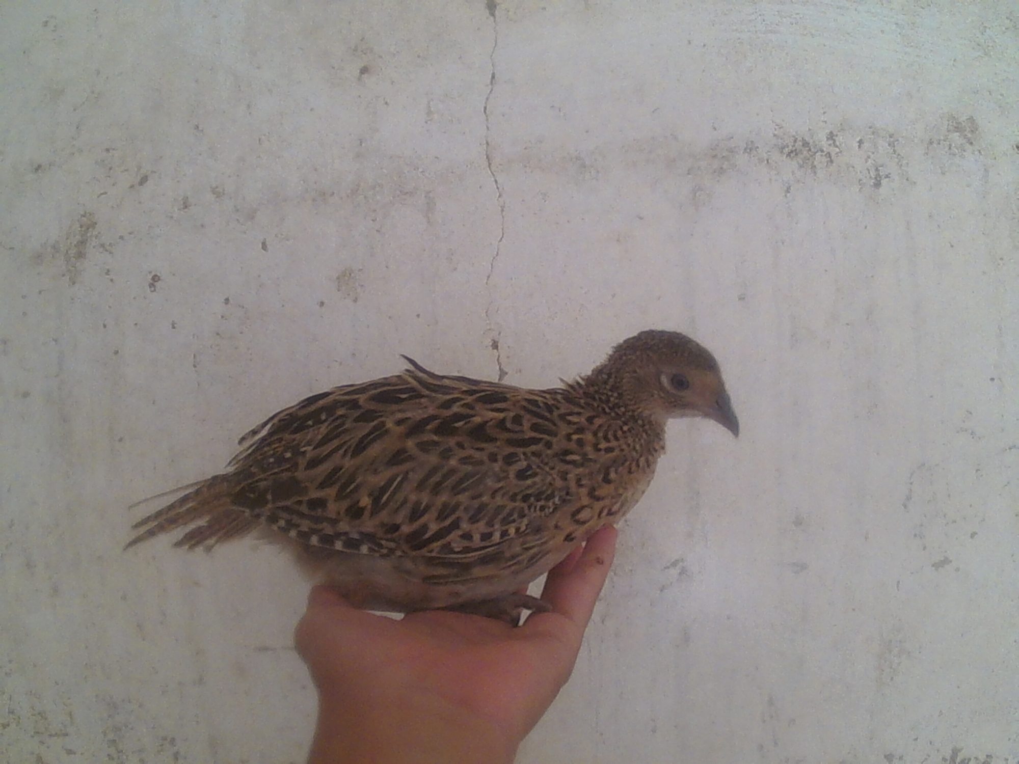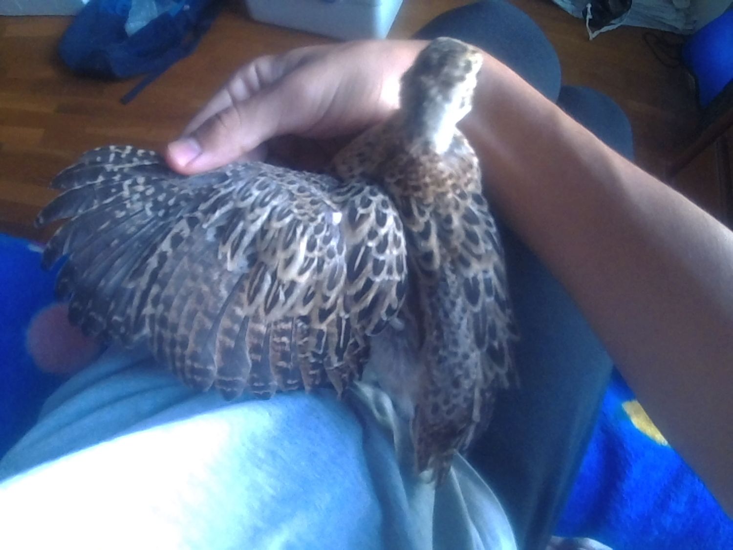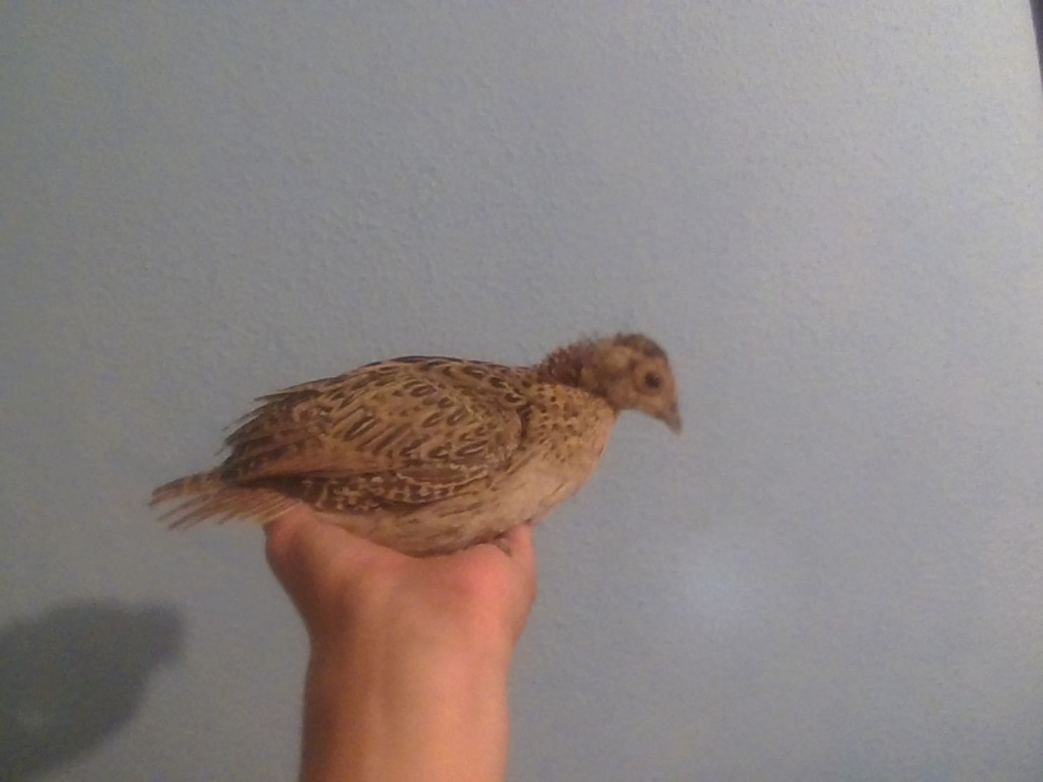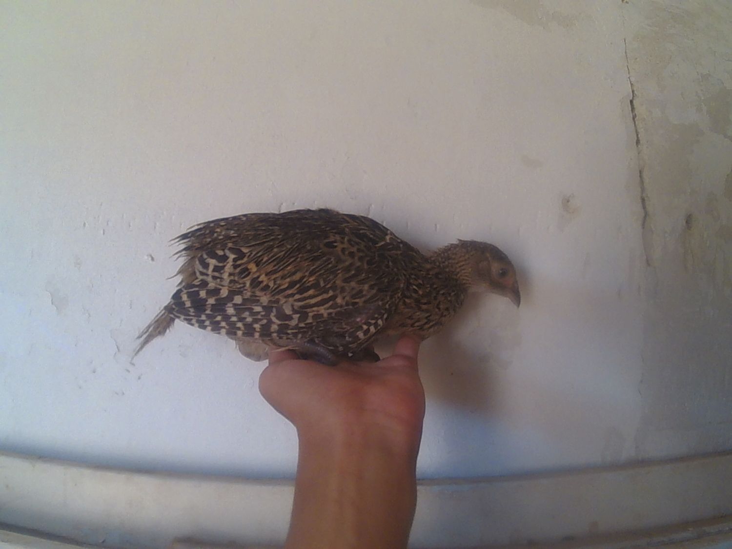 All the afternoon calling my little chick, of the two pheasants I have, he is the more more quiet. Starting the night, my sister came home with the chick, She told me: You haven't closed the door and the chicks start loocking for you, And the pheasant went to the balcony and falled to the street, I went to catch him and because I don't have the keys I went to the house of a friend.
