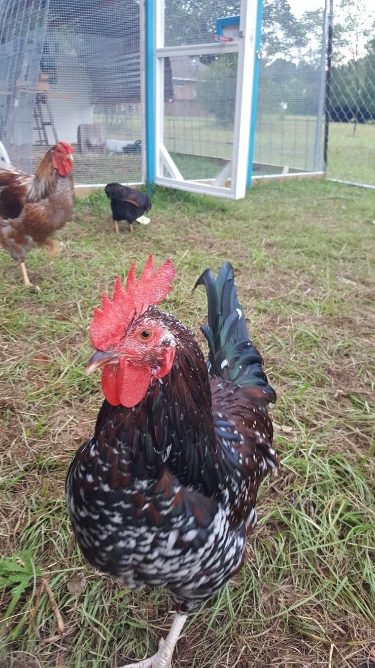 Ringo still knows that I'm the treat giver. He will come roost on my arms or leg occasionally. He has taken a curious peck at my eye but I do think it was curiosity and not malicious. By the time we got to introducing the new flock to the old flock, Ringo seemed to have a better handle on dealing with the ladies. He was a little rough and awkward at first, but he's gotten better and will dance for the ladies. Sometimes. There are still some rapings happening.