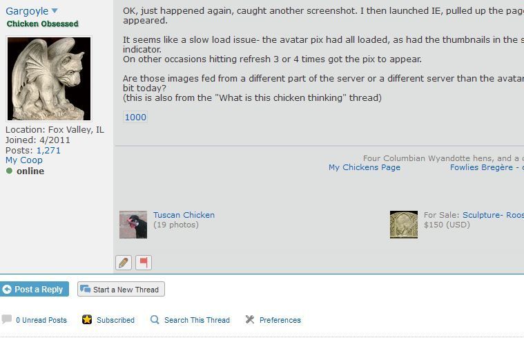 It seems like a slow load issue- the avatar pix had all loaded, as had the thumbnails in the signatures. The page had seemed to finish loading (no more spinning "hourglass" type indicator.