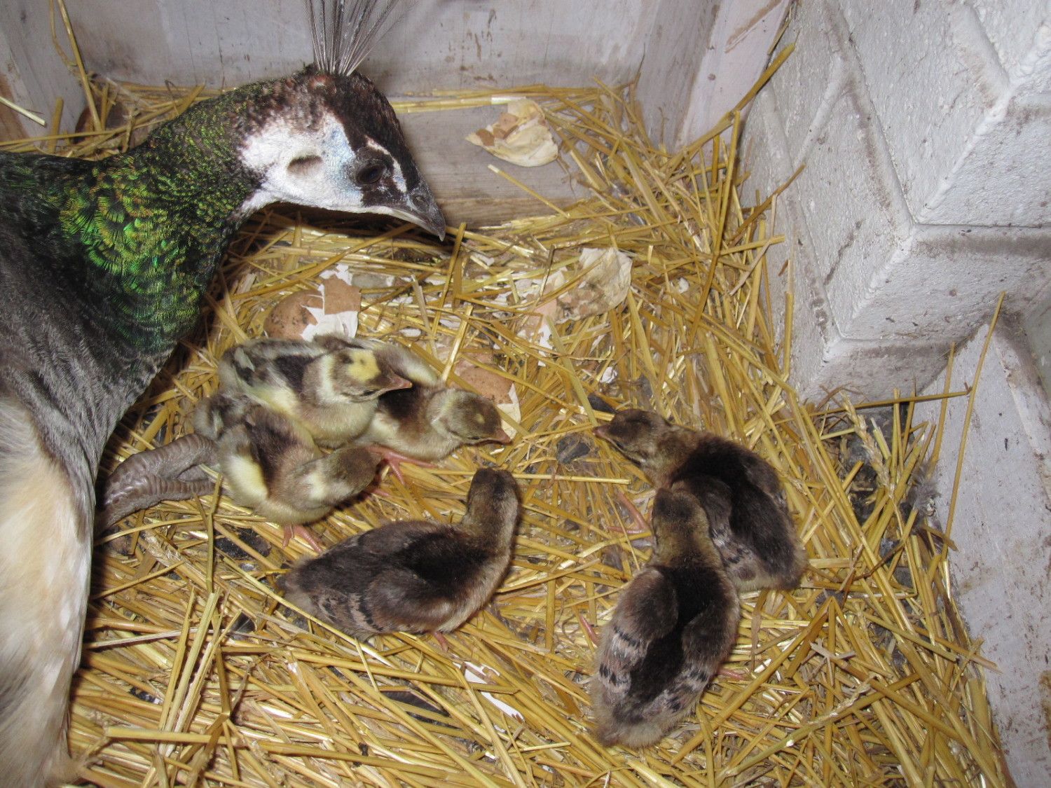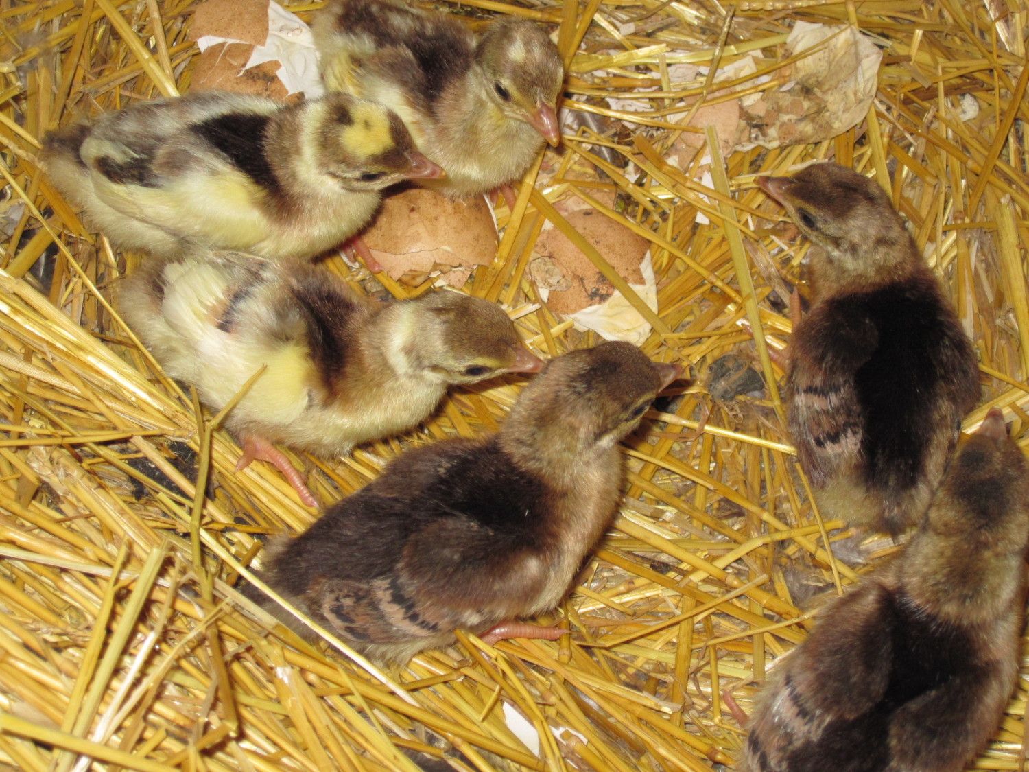 Now when you say w.f.f.- what is that? Maybe white wing feathers? Here are the 6 peeps today. Am I safe in assuming the 3 brown chicks will "appear" as solid India Blues? and the 3 yellows are Pieds? You mentioned a white and a pied gene? how does that work? Then, both my male and female are carriers of a recessive gene? I really appreciate your knowledge about this.![]()