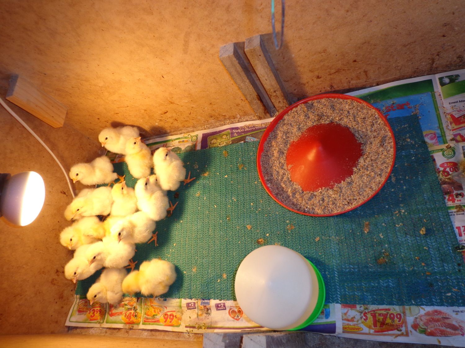 I keep new borns on heat mat covered with 2 pieces of newsprint...60w bulb for heat. Too much heat can cause them to dehydrate. Also I put that rubbery mat shelf liner (for cupboard lining) under them, over newsprint... I get at dollar shops...cheap for large roll. I cut a 12" section and use this for the first week to keep chicks from getting splay legged from slipping on newspaper. You can wash and reuse many times. I have several cut and exchange them daily. First two days I sprinkle feed on them, then 3rd day they have to eat from feeder...they always do. Using this method I have never lost a chick!