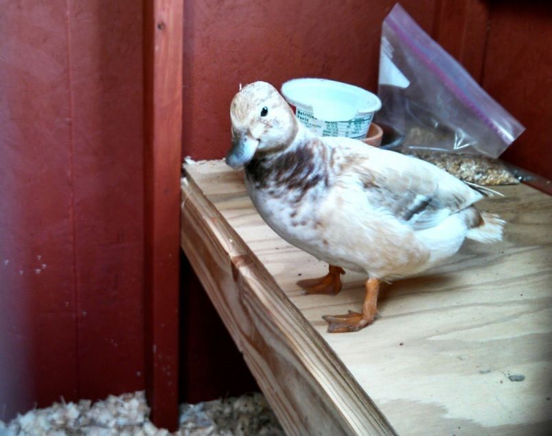 Speaking of li'l duckies, here is miss Trudi-patooti up on the shelf in the duck coop where she isn't really supposed to be. :rolleyes: She's got a good innocent look going on, must be the hens are teaching her a thing or two. (Apologies for the picture quality, it was taken with my phone.)