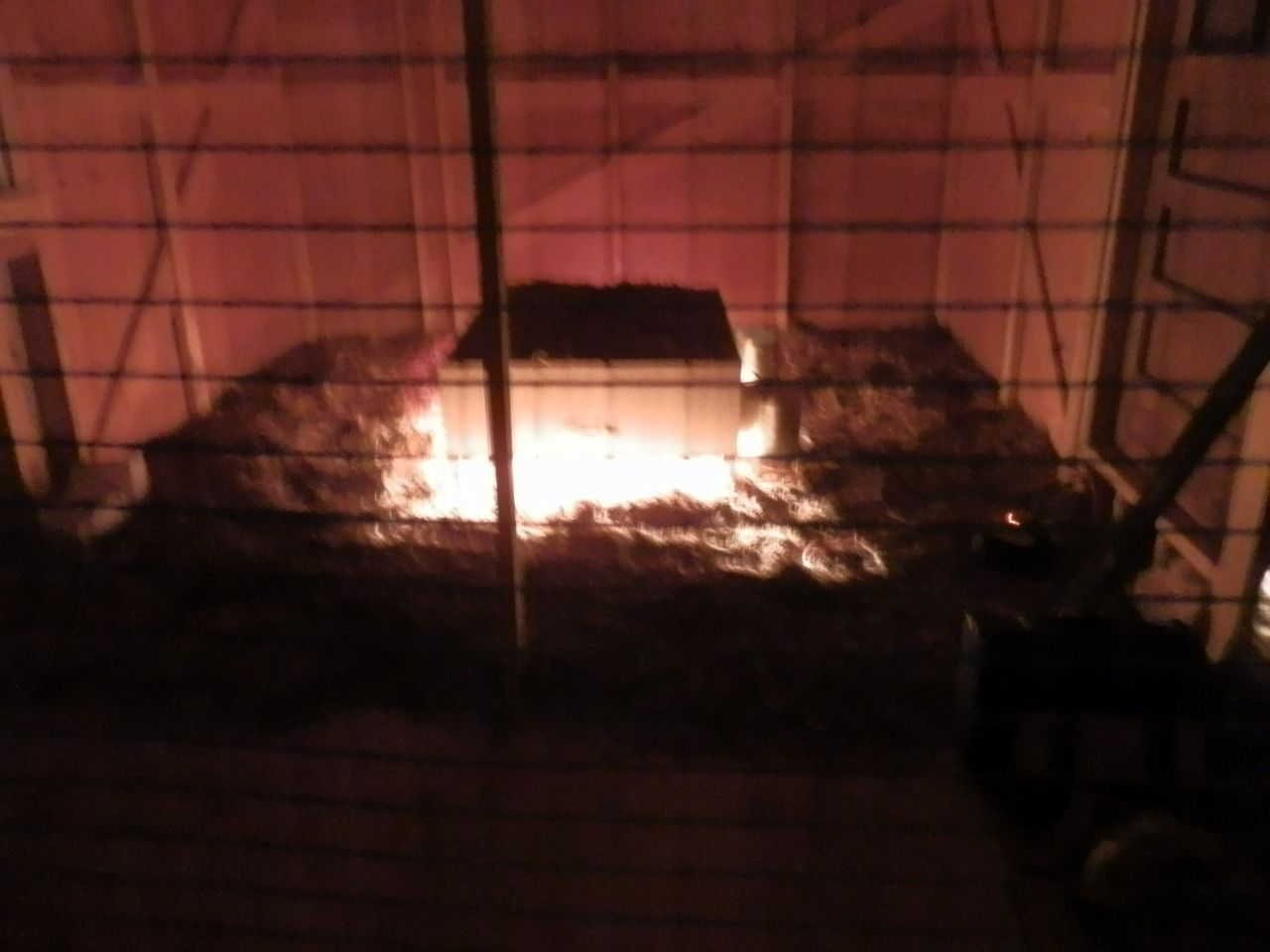 The brooder is 3' x 4' and is inside a 10' x 16' coop modeled after a wood's style open front design. The entire front is wire. There is a couple of inches of wood chips on the floor and the brooder is place towards the back of the 5' of the coop.