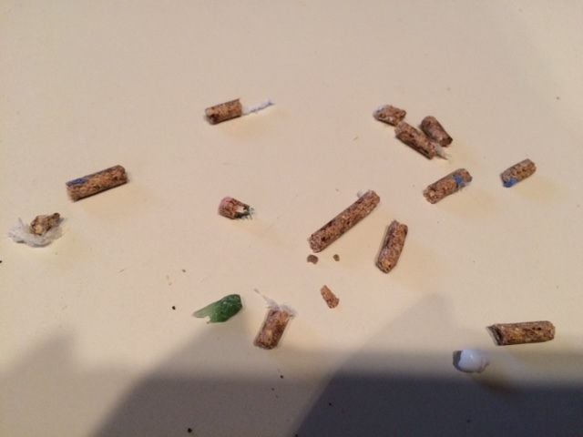 I will have to upload pics from my phone in a minute, but when I was transferring my pellets into my plastic storage container I saw a few flecks of color. I stopped pouring and saw, to my horror, plastic in the food! Some bits are even separate and really sharp! I am contacting the company asap. I bought them at rural king last week. They already ate one bag and I am so nervous that they ingested this stuff!!