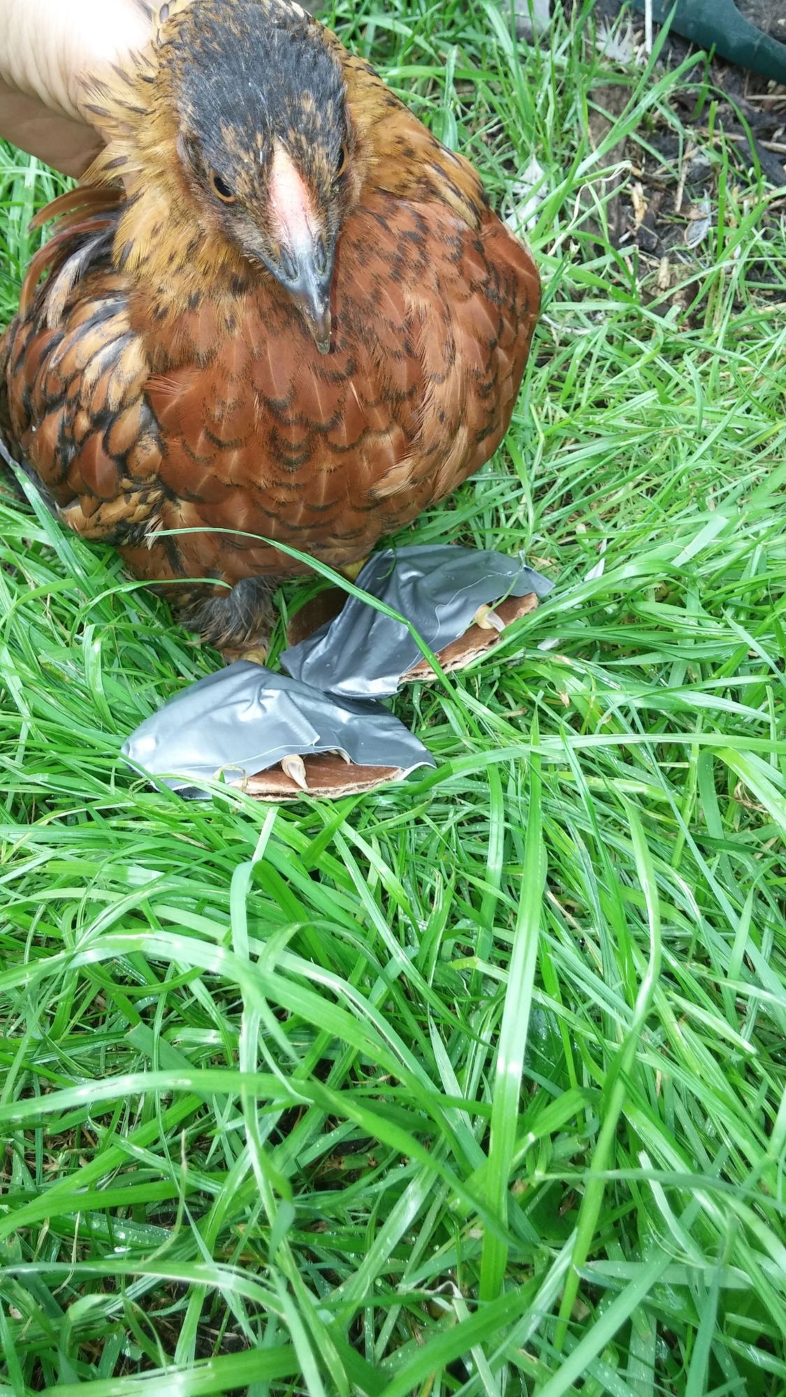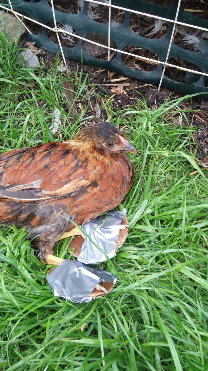 I've used duct tape on peachicks, and yes, it was hard to get off, but she's much bigger, so it shouldn't be an issue. It might take several attempts with various materials until you find something strong enough to keep her feet flat.