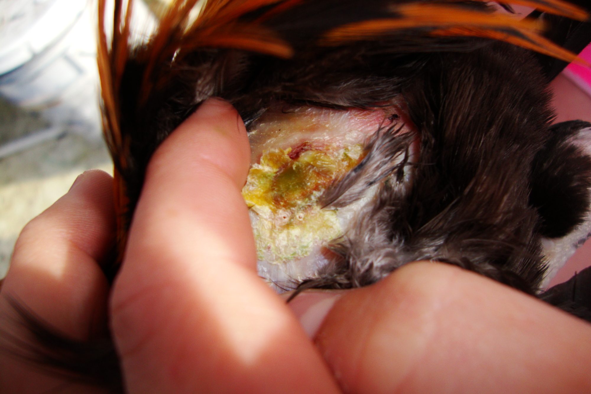yes i have had the heat lamp on it didnt really snow this last winter just rainy chilly and a few flurrys but it got kinda warm out so once in a great while i would turn it off. i dont know if he has been sick but he shivers even if its warm out, he gets cracked corn with wheat and these red balls all mixed together he eats it, he gets out and scavanges alot. i was thinking of four possibilities 1.) a spider bite, 2.) a nervous habit because he sleeps with his head in his wings maybe a nightmare :idunno or 3.) a tumor, and maybe 4.) a old wound that never healed. his poop is green with a white cap (normal) and sometimes carmel coloring he has had for a long time.he sneezes every once in a while and i believe when he was a baby he had a upper respitory infection, no lameness or discharge, and he doesnt peck at it. the first picture is of the festering issue at hand it is close to his oil gland and is on his left hind quarter and the second picture is of him showing how small he is. thank you for your help.