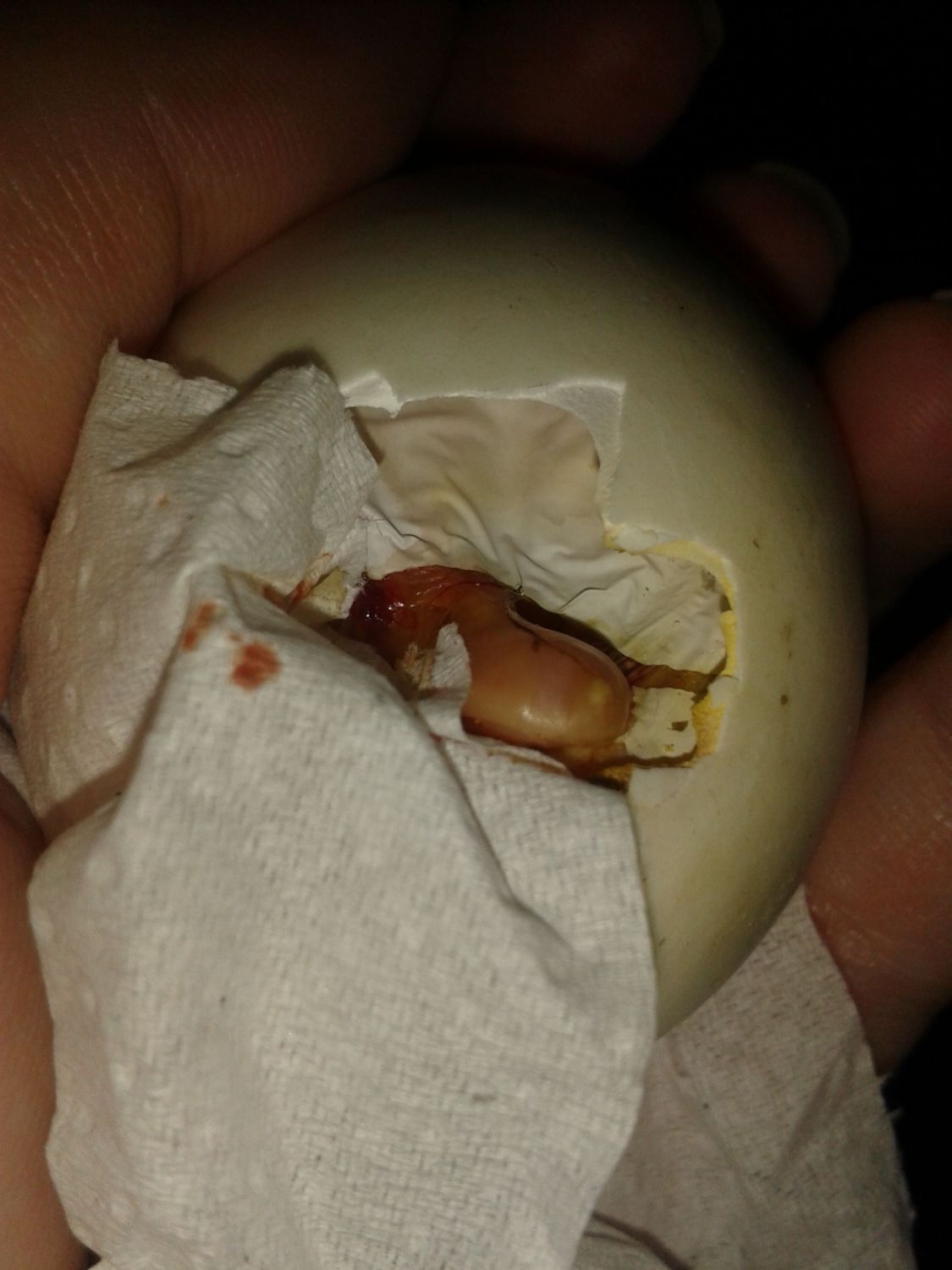 Ok, is that the fat end of the egg (which has the air cell in it)? I can't tell from the angle of the pic. I'm guessing it is since you said you can shine the light through it. Very hard to see the dark spot as well, but I can just make it out. It could be trying to pip there. When you candle it can you see part of the shadow of the duckling sticking up in that open space by this dark spot? That would be his bill and indicate he has internally pipped and is working his way out. Has this spot gotten darker since you first noticed it? Ducklings do rest alot during the hatching process (typically 12-24 hours between each step of hatching), so it's still possible it is alive in there and was just resting when you candled. What day of incubation is it on? With call ducks I believe they typically hatch around day 26, and not day 28 like most other ducks, but that is just a ballpark figure.