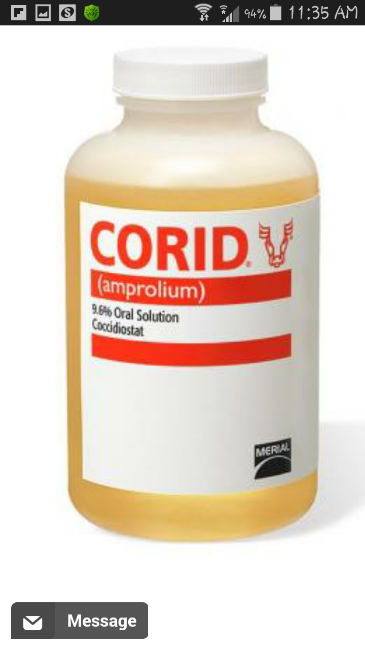 Today is Thursday, how are you going to get it by Saturday? Do the stores carry the powder? Good news I found a feed store in Ada that I didnt know existed and they have the liquid Corid as well as the powder. Im going to go with the 16oz bottle liquid. My husband has direct orders to get a digital scale and the Corid on his way home lol! I will post her weight as soon as I weigh her.