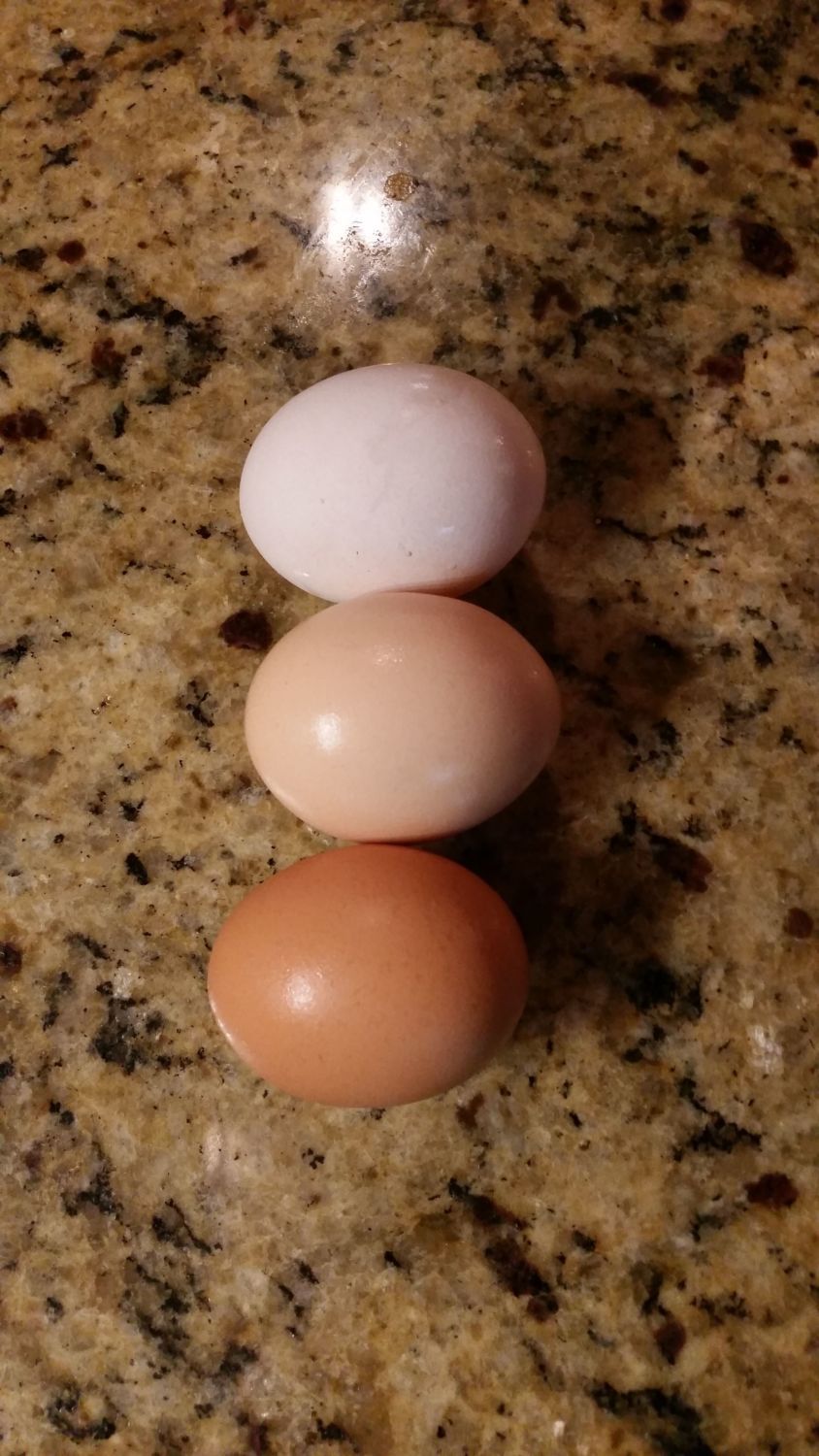 A single chicken of mine (Rhode Island Red) has changed the color of her eggs from brown to tan to almost completely white over the past three days. I've never seen anything like it. Her diet hasn't changed since adulthood. Please help me to know whats going on.