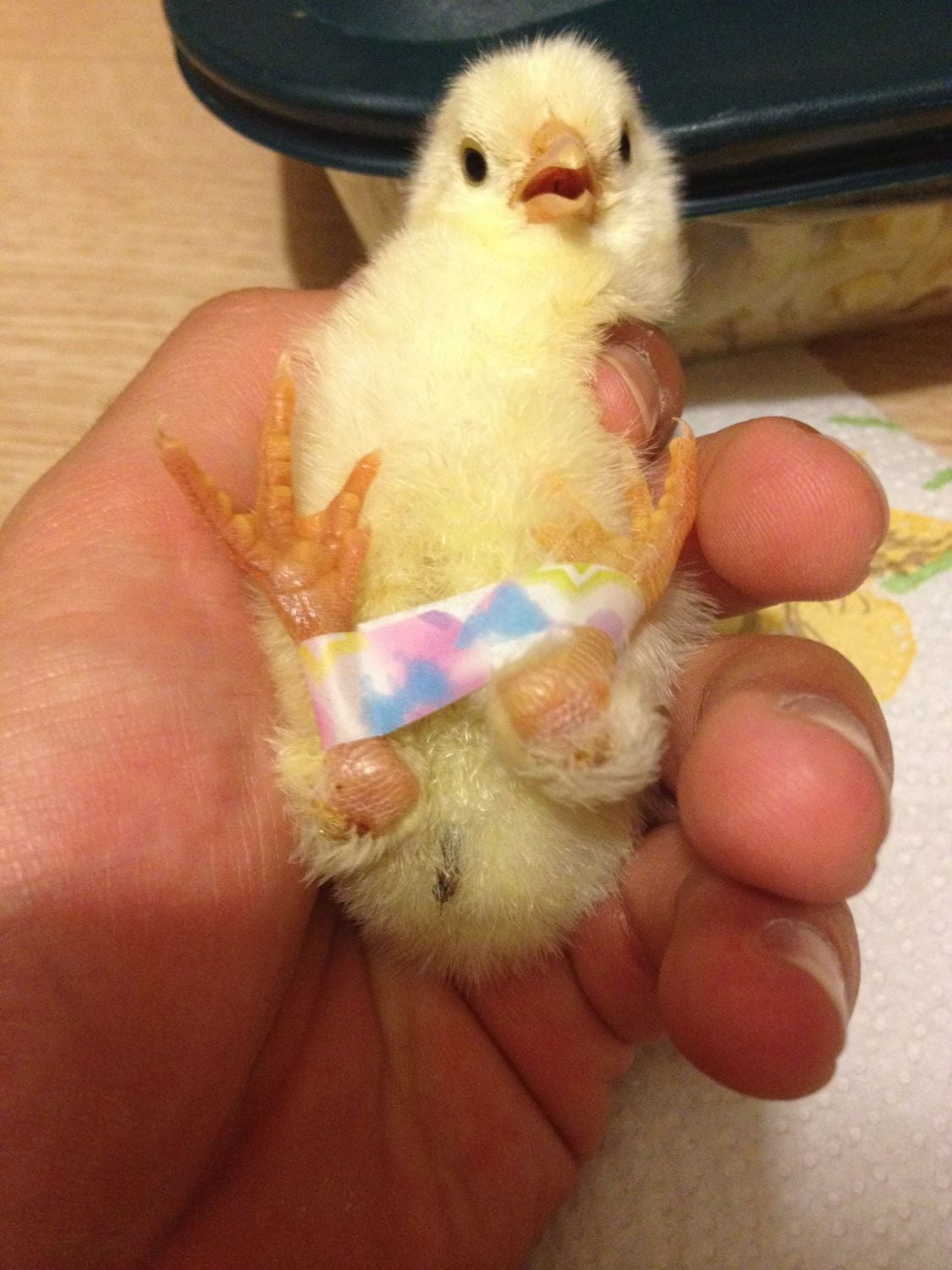 Slipped tendon is a possibility, and a rotated femur may also be a problem. Vet wrap cut into strips is a good thing for splinting. These are much harder to treat than splay leg. Here is a more updated sight of Poultry Pedia, and here are a couple of more links: https://www.backyardchickens.com/t/756556/slipped-tendon-splayed-leg-confused https://www.backyardchickens.com/t/...ick-slipped-tendon-broken-help-video-provided https://sites.google.com/a/poultrypedia.com/poultrypedia/poultry-podiatry Picture of chick chairs by Artysrobin