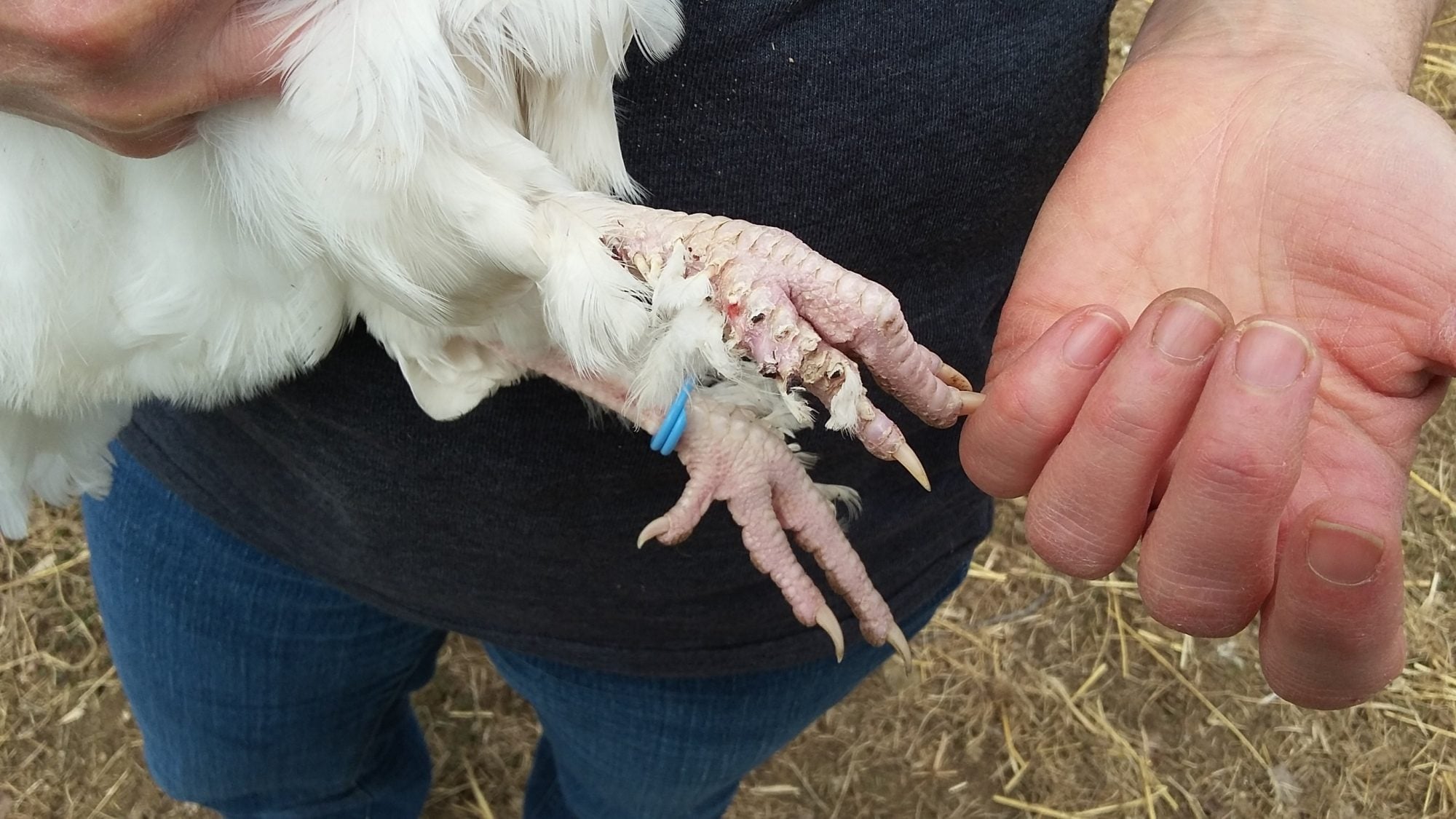 My White Marans has missing/broken feathers from one foot. She also has a bald patch on her chest that has the same broken feather look that the feet feathers have. I haven't seen any of the other hens pecking at her, so I'm wondering if it might be some parasite? Does this look familiar to anyone? Thanks for the help!