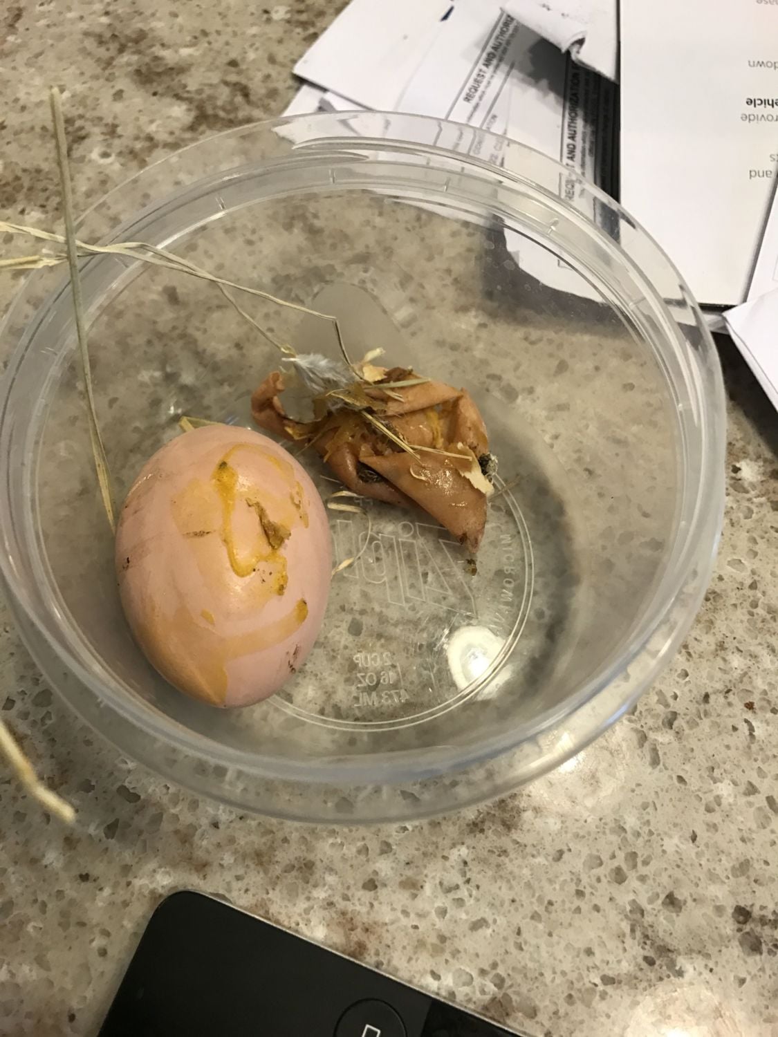 What you see in the picture above is a ceramic egg we put in there to gauge their behavior and nesting tendencies, next it to we found this leathery skin looking shell, I presume, and the ceramic egg covered in yolk. I'm guessing they laid this egg at night since it wasn't in a nest box it, looks like they pooped it out at night while they were sleeping based on where we found it.
