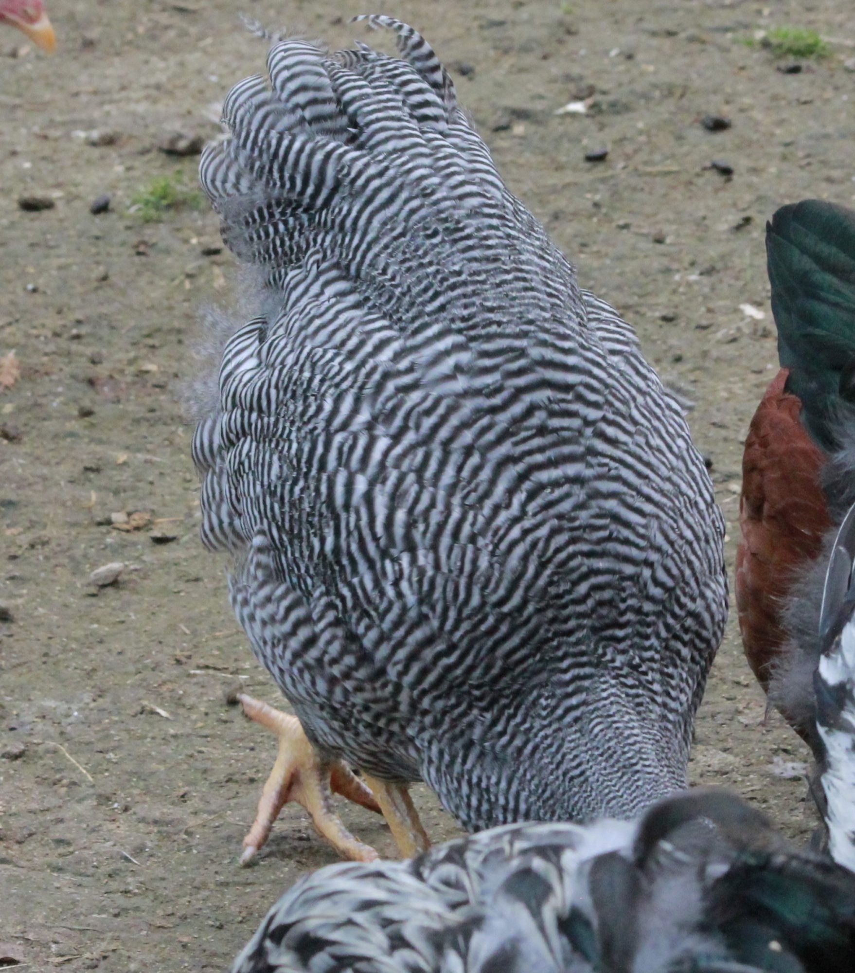 A "cushion" is a big mattress looking fluff of feathering on the back, in front of the tail. It is very unattractive on a Rock. Some varieties of Rocks were made by using bits of other breeds, in other words, a composite. From the Brahma in the composite comes the cushion issue. Lots of breeds fight this.