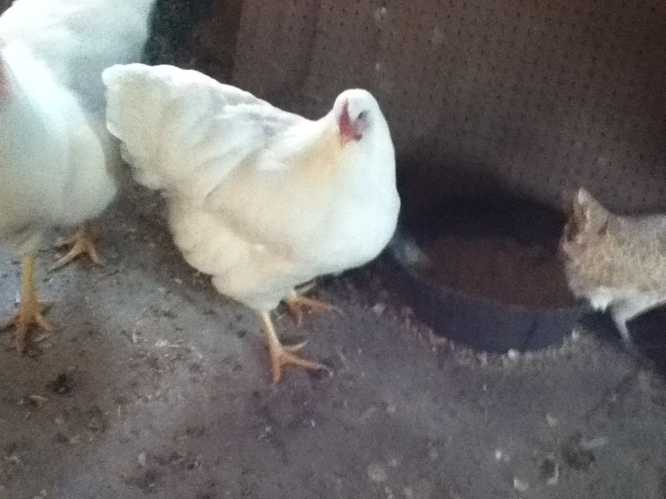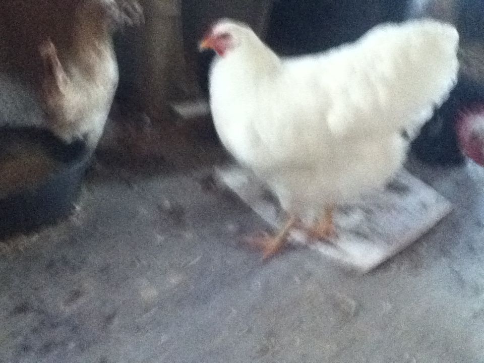 My cockerel has never shown an interest is any of the other chickens, except for one d'uccle pullet that for some reason he doesn't like at all. Well apparently he was just waiting for me to get one of his "own kind". It was very difficult to get a decent picture of her, because when I went to take a picture he would stand between me and her, I go to the other side so does he. So got a lot of picture with him in the way and very few of her. He did the wing dance 3 times and has not quite following her. She started a fight with a bantam mottled cochin and he broke it up by pecking each on the head.