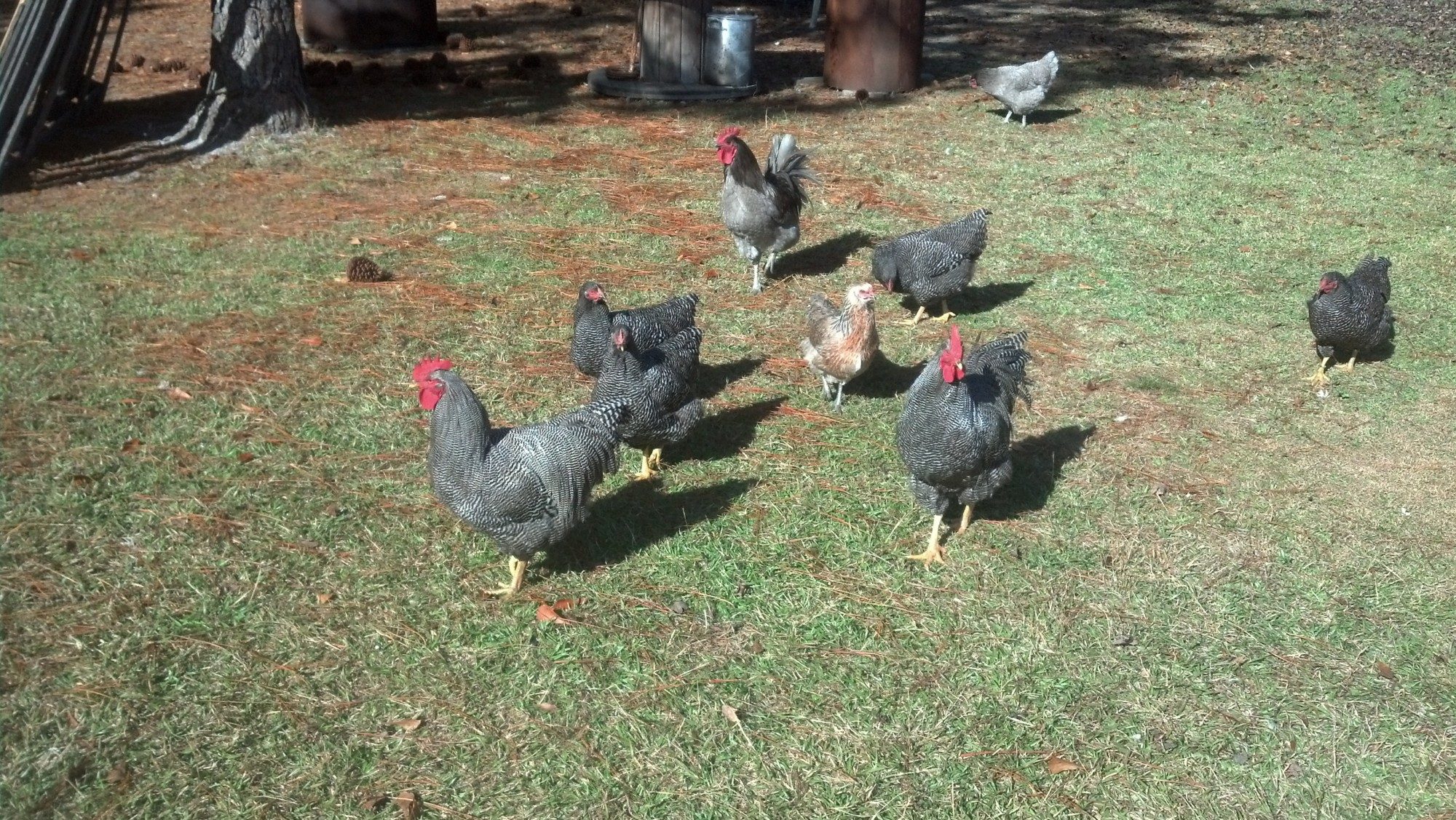 Your hens are beautiful. They look huge! I hope your hen is okay. My rooster was acting odd today as well. He is usually in my space, trying to see what is in the bucket. Today he was nearby, but didnt try to look in the bucket and didnt make sure to push everyone out of the way so that he could eat first, which is so unlike him. He just isnt acting himself, but seems to be healthy. I picked him up and examined him, he is good size, and overall seems healthy, his comb and wattles were a little light though.Thank you, Scott! They sure did have a good time today. The BR hens are the ones who are the most industrious of all my hens out there in the woods. One of my Dellie hens was out roaming with them, but for some reason, Georgie didn't seem to feel well today and was just standing around looking spacey. She is about to turn 5 years old and hasn't been laying in a couple of months so I hope she's okay.