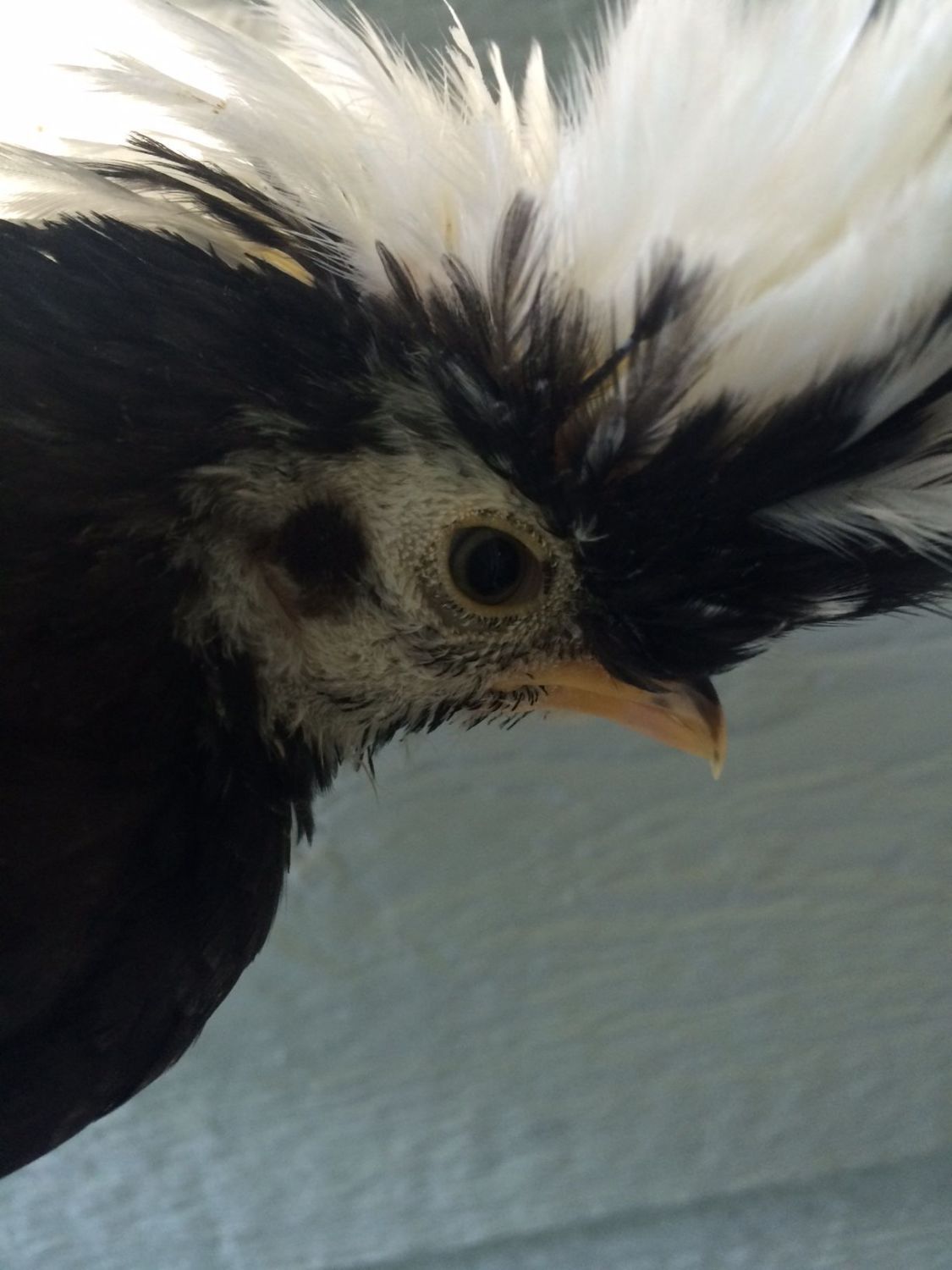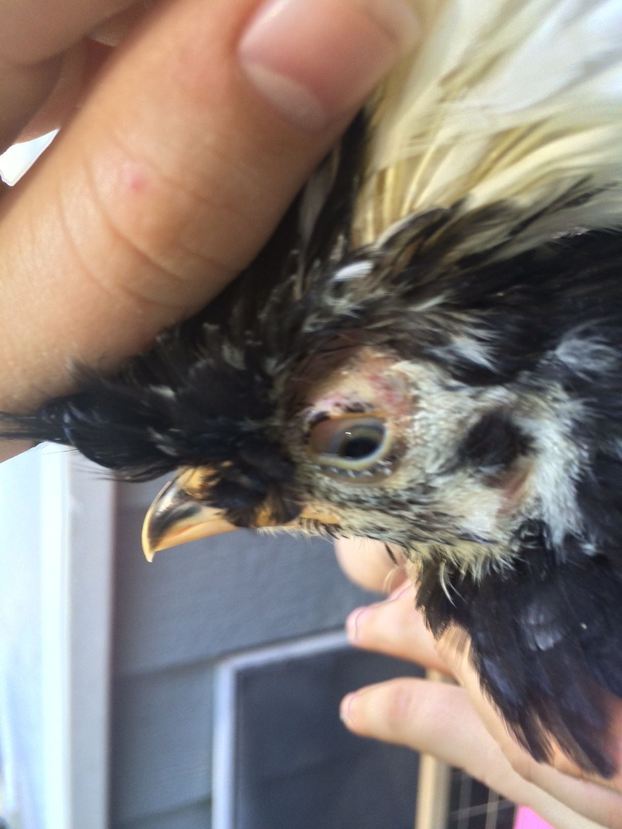 I have a 6 week old polish chick that I think has an eye/poof problem. Her poof is leaning so heavily on one side that she can hardly see, and there is some slight bruising.