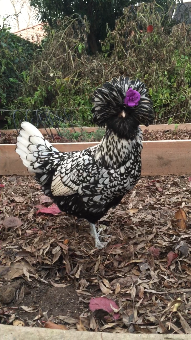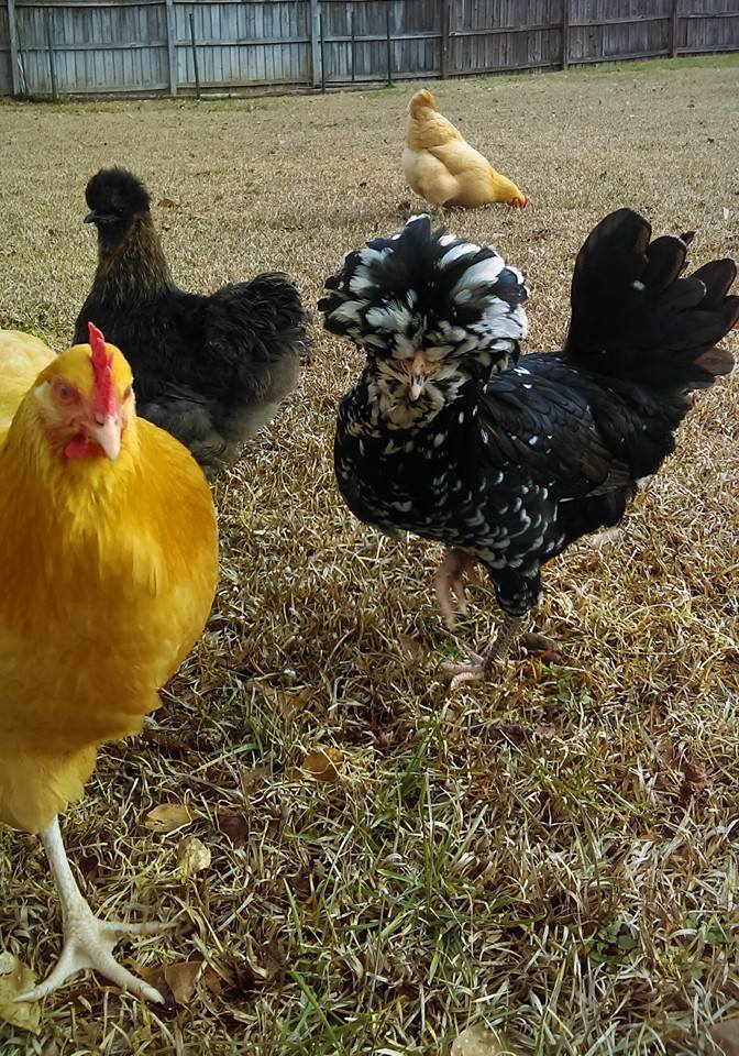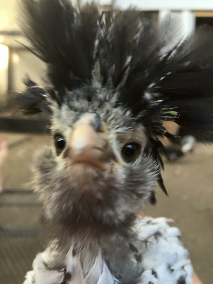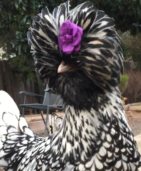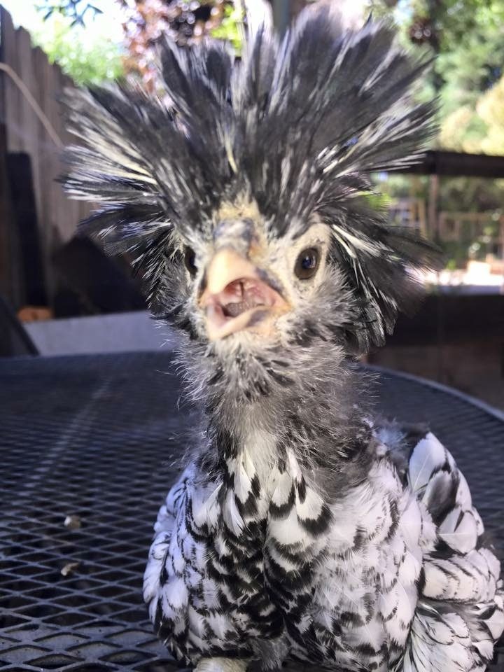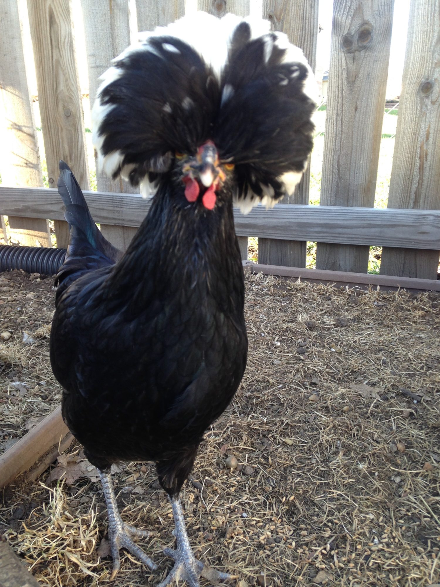 I have two Polish here is a picture of my rooster. I will try to get a picture of the hen. I have a question though, what do you guys do about the other chickens pecking at their heads when the feathers get wet? They basically leave my roo alone but the hen gets her head pecked and feathers pulled out every time it rains. I have to give her a "ponytail" to keep them off her, which is fine except when it starts raining and I am not home. Right now it has started raining and I am at work and all I can think is "I have to go home to ponytail my chicken" is there an easier way to deal with this problem?