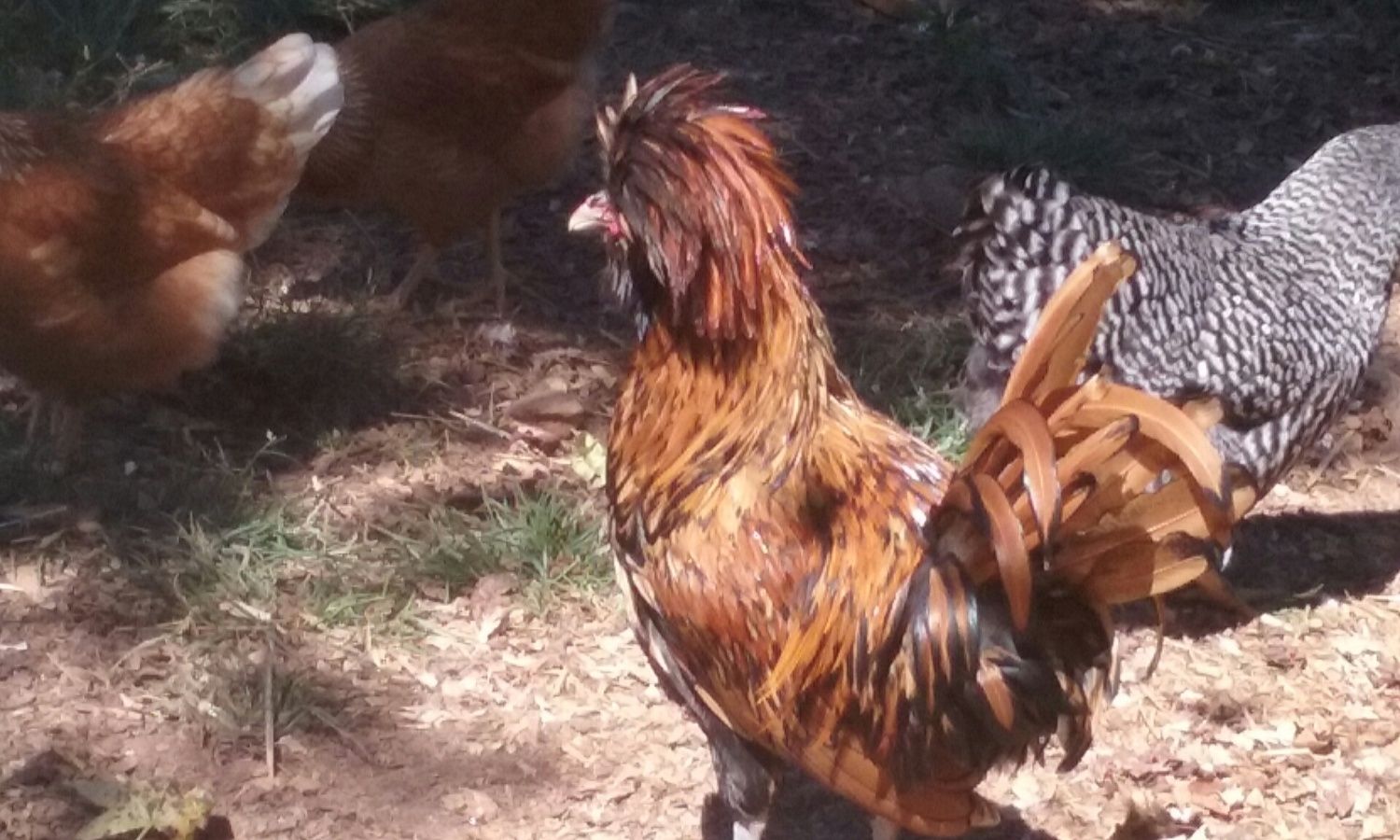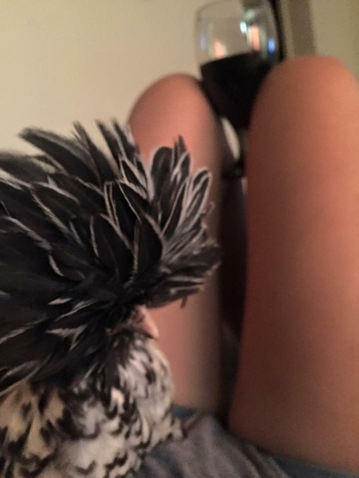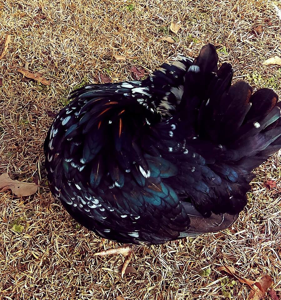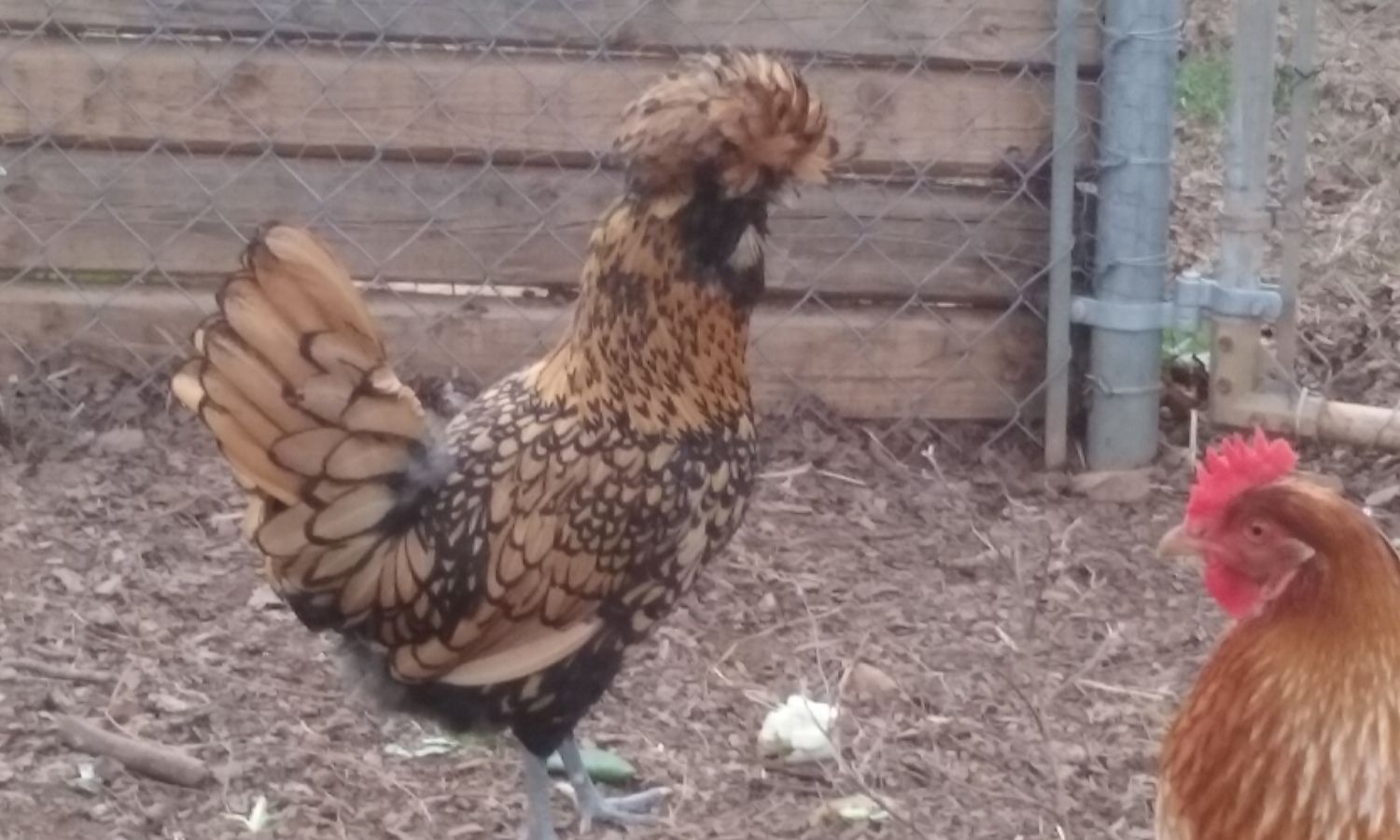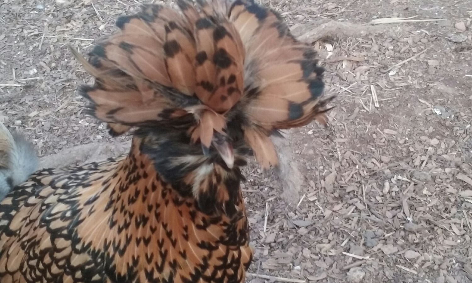 I have two Polish here is a picture of my rooster. I will try to get a picture of the hen. I have a question though, what do you guys do about the other chickens pecking at their heads when the feathers get wet? They basically leave my roo alone but the hen gets her head pecked and feathers pulled out every time it rains. I have to give her a "ponytail" to keep them off her, which is fine except when it starts raining and I am not home. Right now it has started raining and I am at work and all I can think is "I have to go home to ponytail my chicken" is there an easier way to deal with this problem?