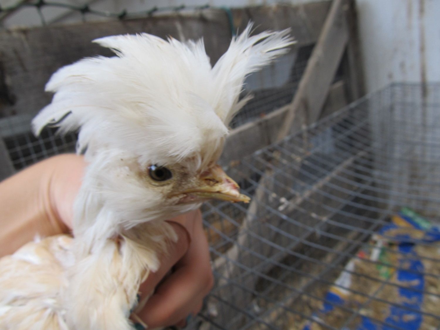 I'm pretty sure that is a hen. She had a perfectly symmetrical poof on top of her head. From the pictures I couldn't see any pointy saddle feathers. She also didn't have a red comb or wattles.