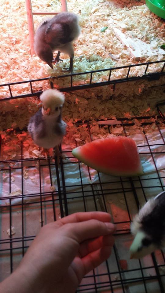 My chick, Drusilla, got watermelon for the first time today and she LOVED it. I wish I had gotten more pictures. She kept sitting on top of the slice. Cute white crested blu and that looks like a houdan bottom right sneaking a bite !