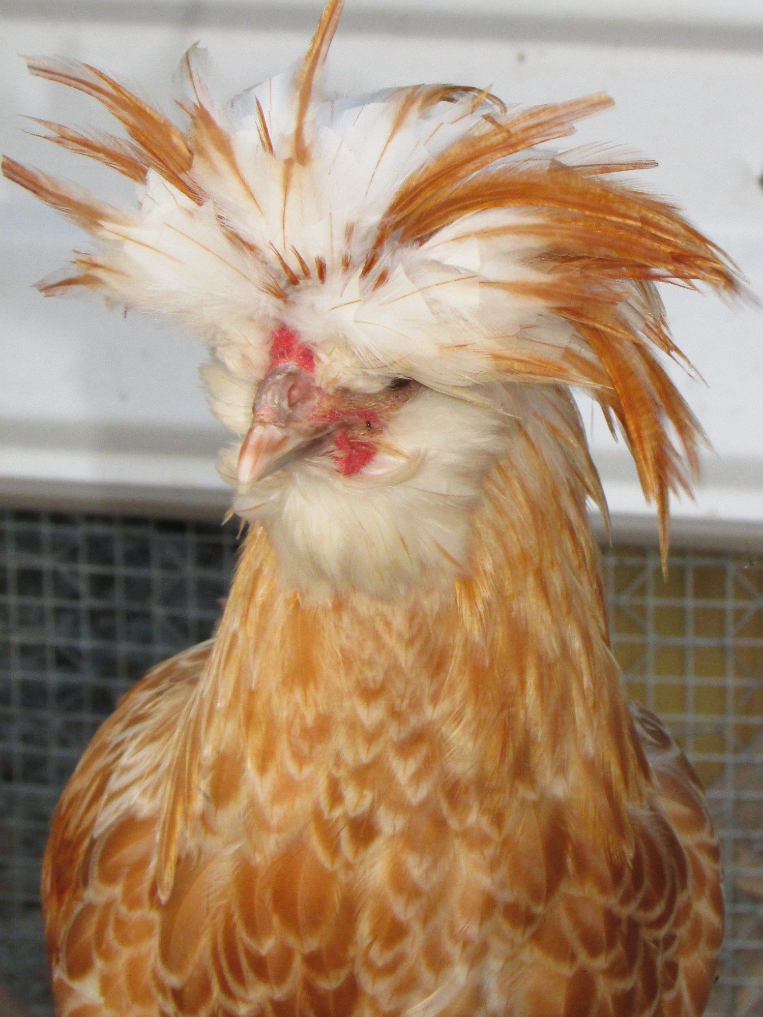 None of my Polish could see anything either and they bumped into things (and other chickens). All my Polish got hair cuts... boys got mullets and girls got a mini-fro. Here is Ozzie before her hair cut. Poor girls couldn't see a thing.