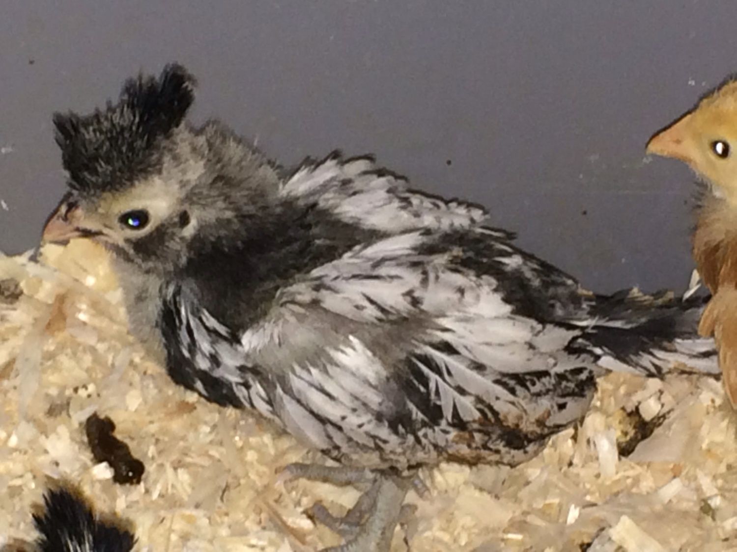 These are some of our new chicks - about a month old now.  They are a mix of frizzles & smooth.  I'm curious about the ones with "less" of a poof.  Are they polish, or is there another close-to-polish breed that I've picked up by mistake?  Also, what would the coloring on the black and white polka dot ones be, are they a splash?