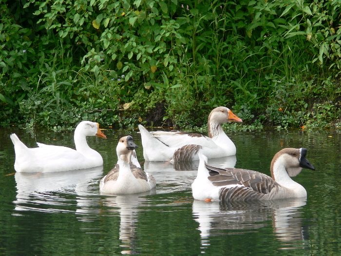 i wanted to share a picture of my geese. a friend gave them to us last summer. she told me that one of them was a pomeranian. looking at pictures of pomeranians, she definitely looks like one, but there seems to also be some slight differences. i was wondering if you could take a look and tell me if you think she is a pure pomeranian or maybe a cross? i couldn't find a picture of her out of the water, hopefully you can see her well enough in this picture.