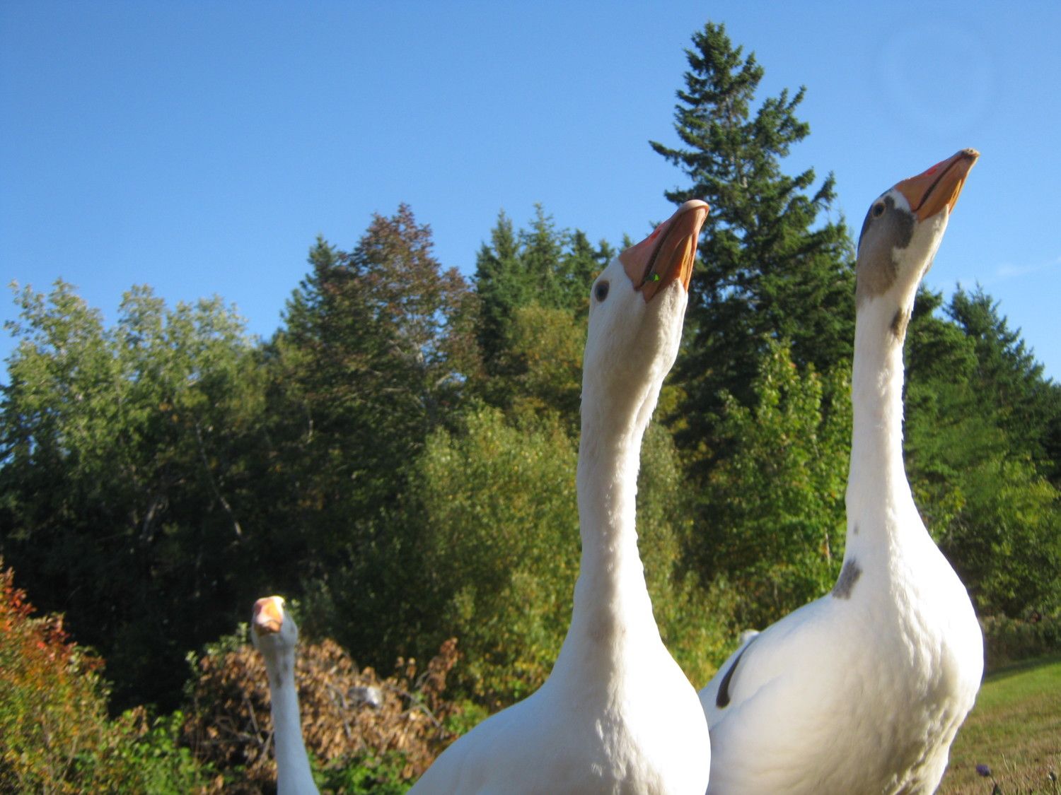 Her husband is a HUGE brute- I'm guessing Embden, and the three younger ones are also pure white. I was hoping for some type of auto-sexing gene, but I'm 95% sure one of the white offspring is a female, so that shoots the hypothesis down. I was hoping my three not related crossbreds were 2 females and one male- but the one I was hopeful is female- climbed on this this saddleback goose today, and did a teenager's interpretation of sex--well, tried. Had the wrong parts in the wrong places...