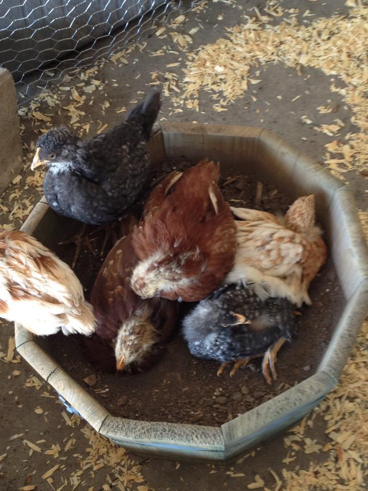 I have two old planters that are filled with dirt from the garden for dust baths. My girls love them so much I call it the chicken hot tub!
