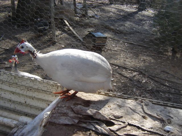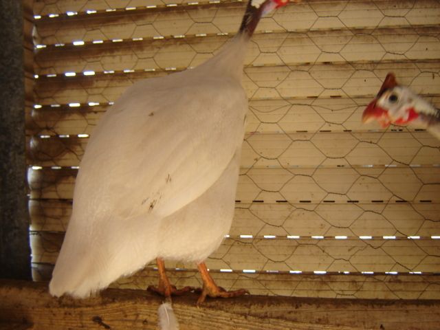 We have pearl, white, and lavender guineas, and I've been breeding & raising them for about 4-5 years now. We hatch about 30-60ish a year, but never before have I hatched and raised any that look like this yet. We have chickens as well and normally let them share in the hatching part. Normally we just get the usual colors, pearl, white, lavender, pearl pied, and lavender pied, but once or twice we have gotten an off-white colored keet with very light tan markings on the head. Sadly the rare one or two keets we've hatched with this color have always ended up dying for one reason or another. This year my blue Silkie hen hatched about 11 keets in June. Some pearl, lavender, and about 3-4 whites. After a couple days of their hatching I noticed it looked like 2 of the whites might have light tan on their heads and backs. I was tempted to bring them inside for safer keeping but since everything was going well out there I decided to leave them with the hen. Anyway, they grew up to look like normal white guineas and I kinda forgot about them(hehe). That is until August when I noticed the three whitish-tanish pearled guineas in my grow-out pen. My initial thought was Buff Dundottes, but since I'm not very good at genetics yet I wasn't sure if this was possible. Throughout probably the past month or two they have lost a lot of their tan coloring and are mainly white/off white with pearling all over. Here are some pics of them in August and some from today.
