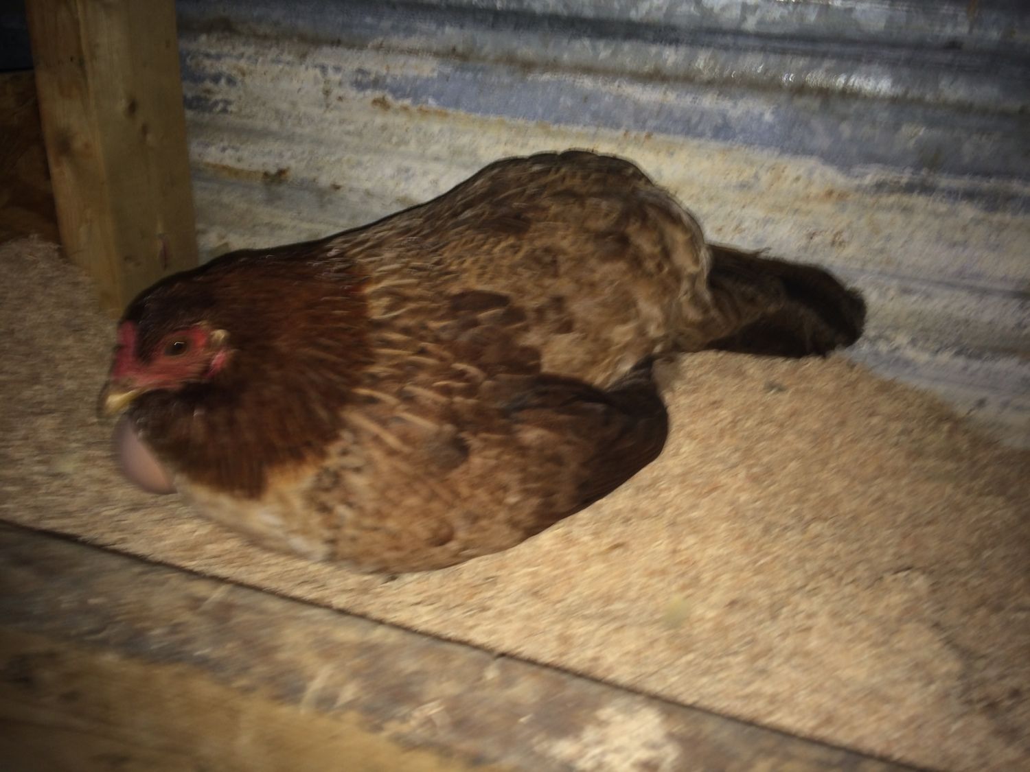 She has that pancake broody form. I startled her with the flash. but shes not making broody noises but she wont get up??