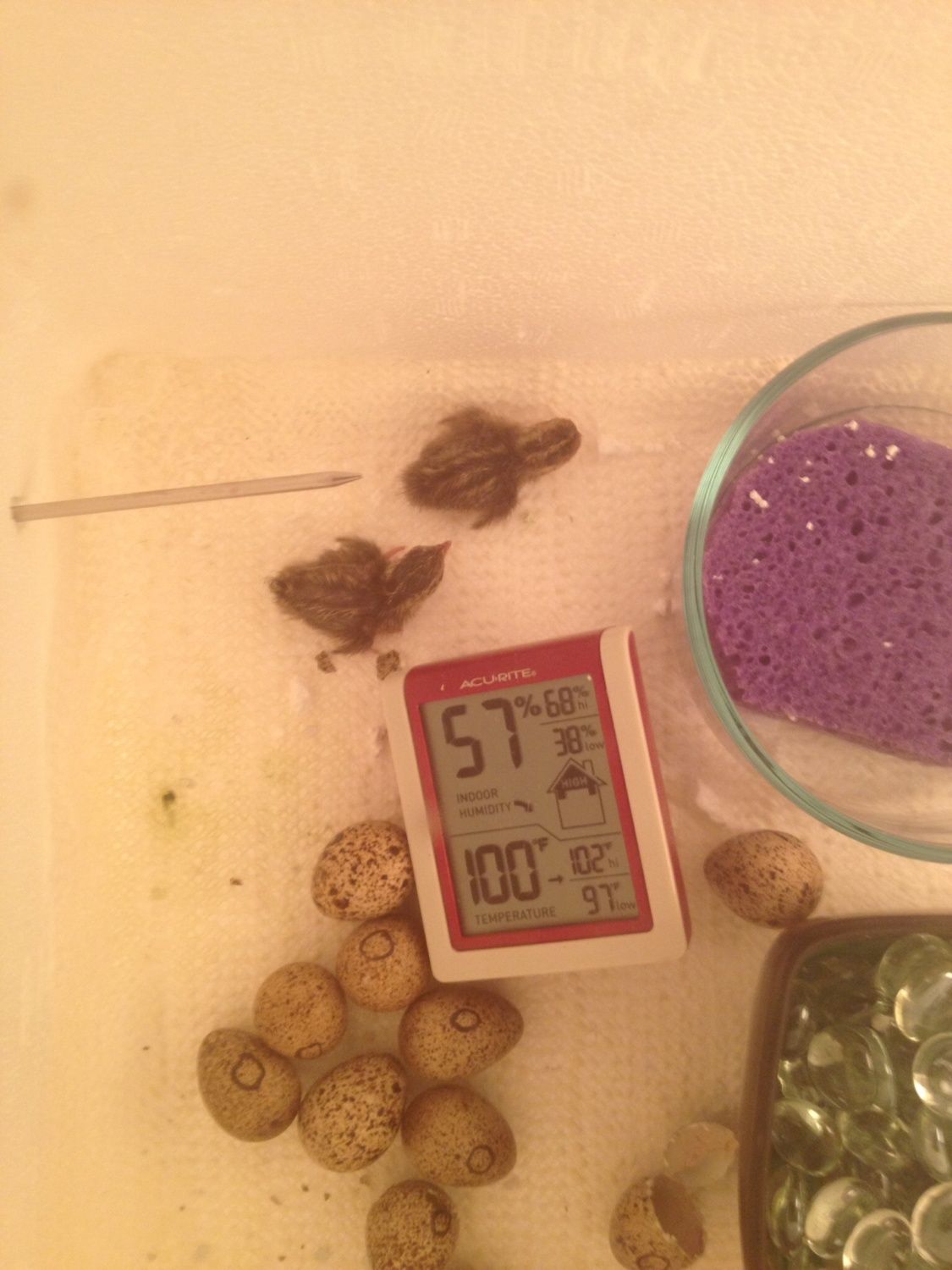 Good questions! That's just more styrofoam. The glass marbles helped me steady the heat.. I didn't want to use a plastic water bottle so I knew I had to use glass marbles for their drinking water once hatched, so I killed two birds with one stone.. No pun intended.