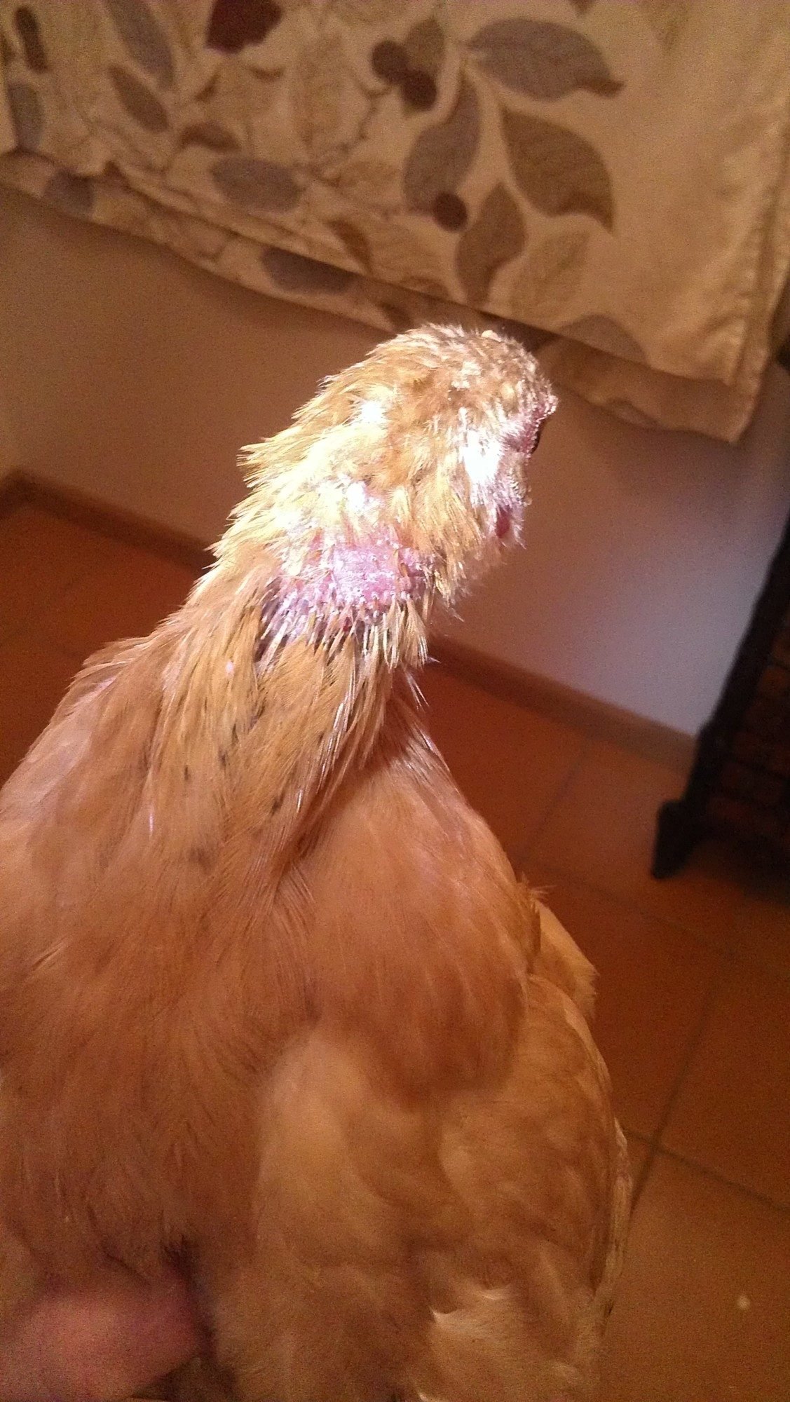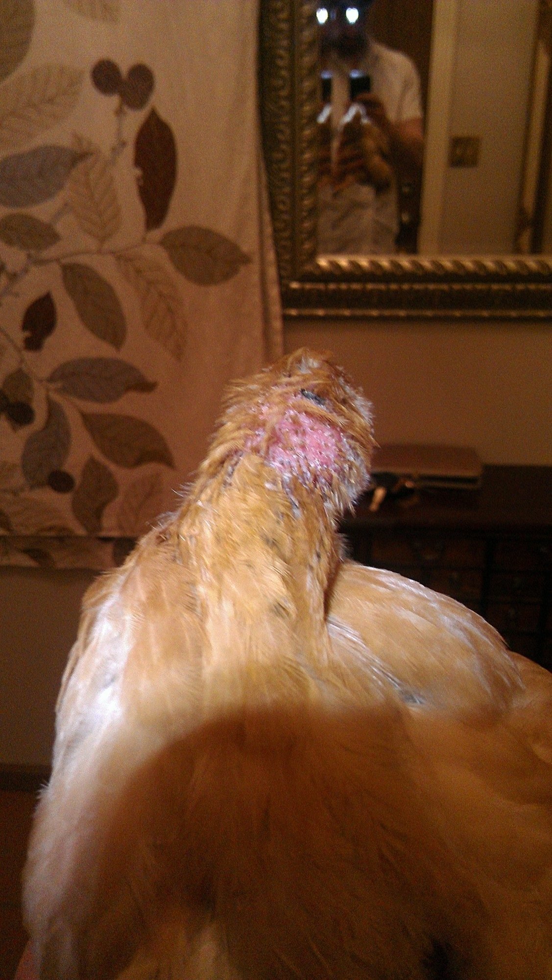 I have 31 Freedom rangers. One month old. Placed outside into their tractor 3 days ago. Today one bird had a bald spot on the beck of its head, a large scab, and the skin felt swollen & "tough" compared to other birds.