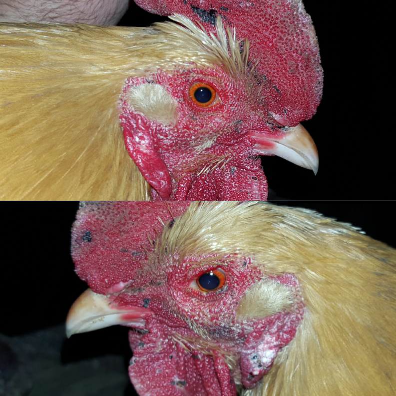 My other chickens include two separate bantam mutts, 4 RIRs, and then another Orpington rooster and an Orpington hen. They're free range during the day, but I coop them up at night. The two cocks never get into any serious fights, just occasional pecking at each other for dominance. They've spent their whole lives together and get along well. The rooster with the infection is even the dominant one, which lowers even more the likelihood that it was from a skirmish.