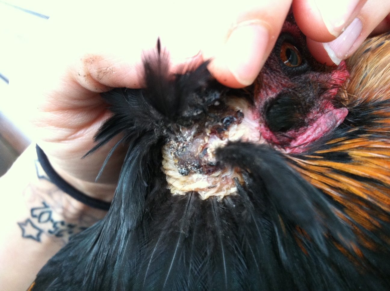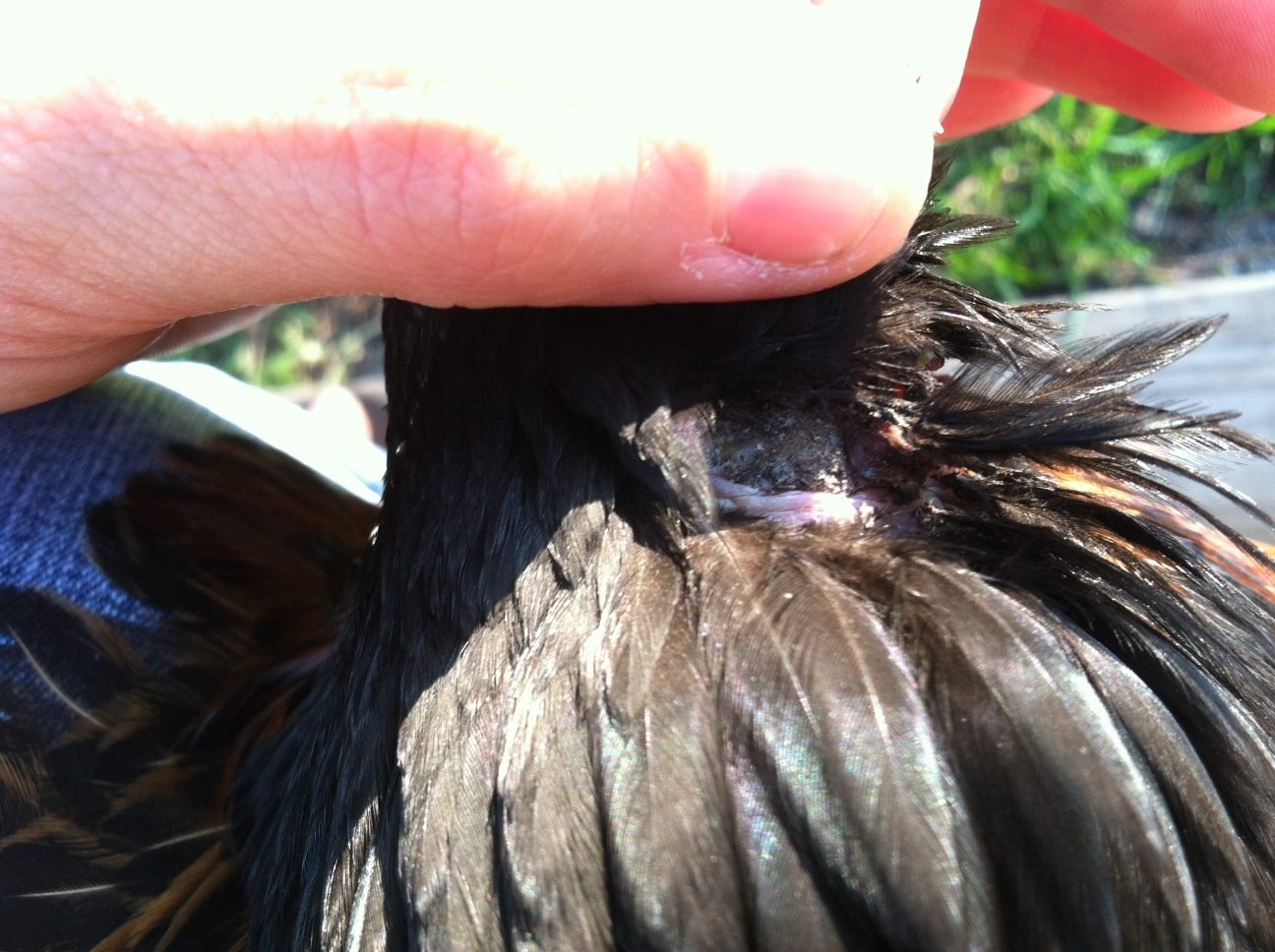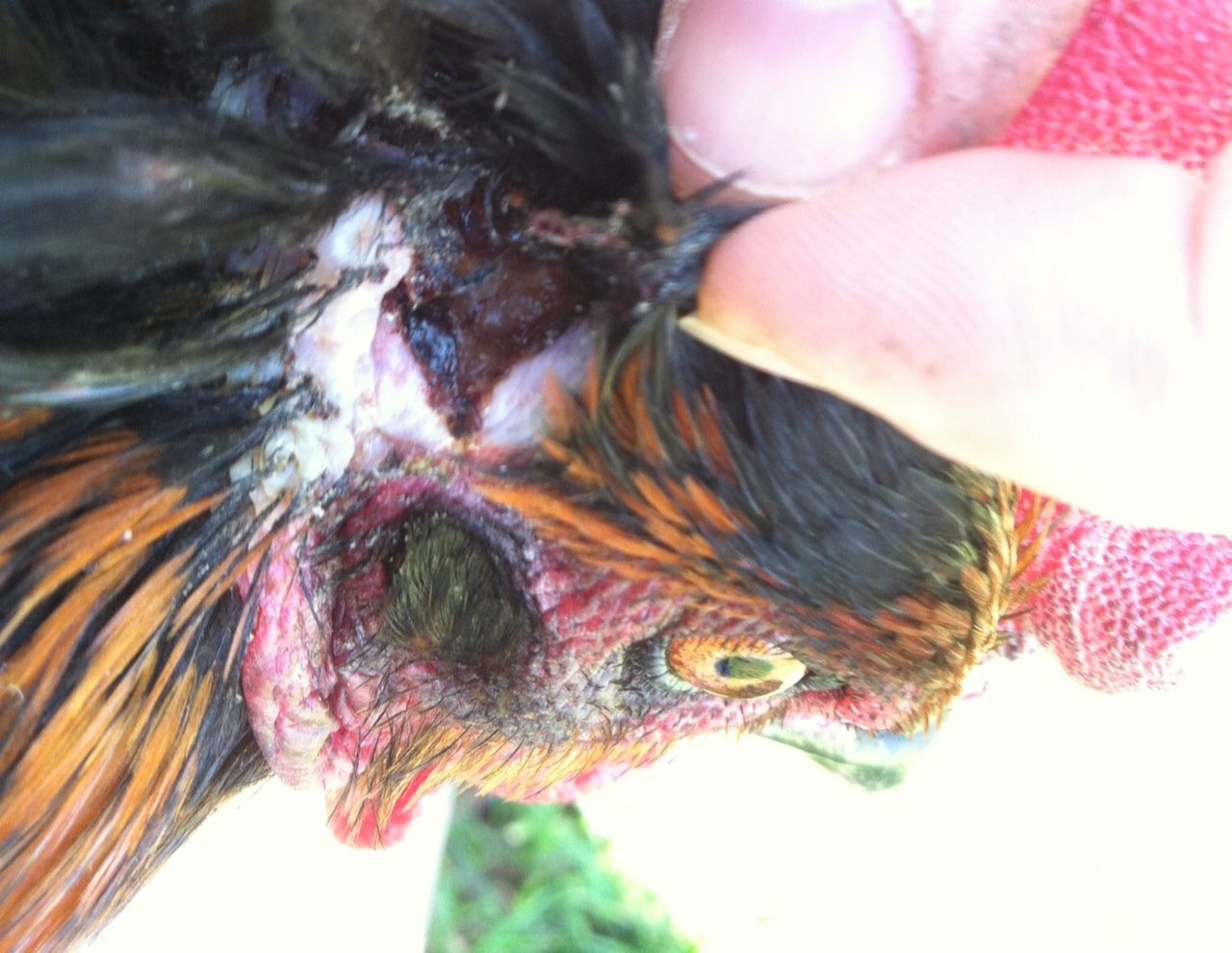 A few days ago I noticed some of the feathers on one of my hens looked strange, I picked her up and petted her, she seemed fine so I didn't examine it. Then, yesterday I noticed there was a bald spot and few of these feathers were sticking out. I picked her up and noticed this gaping hole in her neck. I've read plenty of threads on here about how to clean wounds, but since it's been a week, I'm not sure what to do.