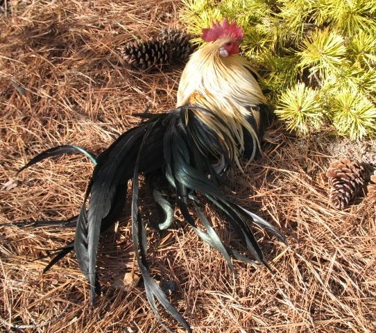 I guess I am to blame for the Red Pyle cock as my birds are mixed breedings, blends and selections made from many stock sources across the country over the past 15 years. I've been involved with raising chickens for over 45 years, but the longtails have been in my breeding programs for only the last decade and a half.