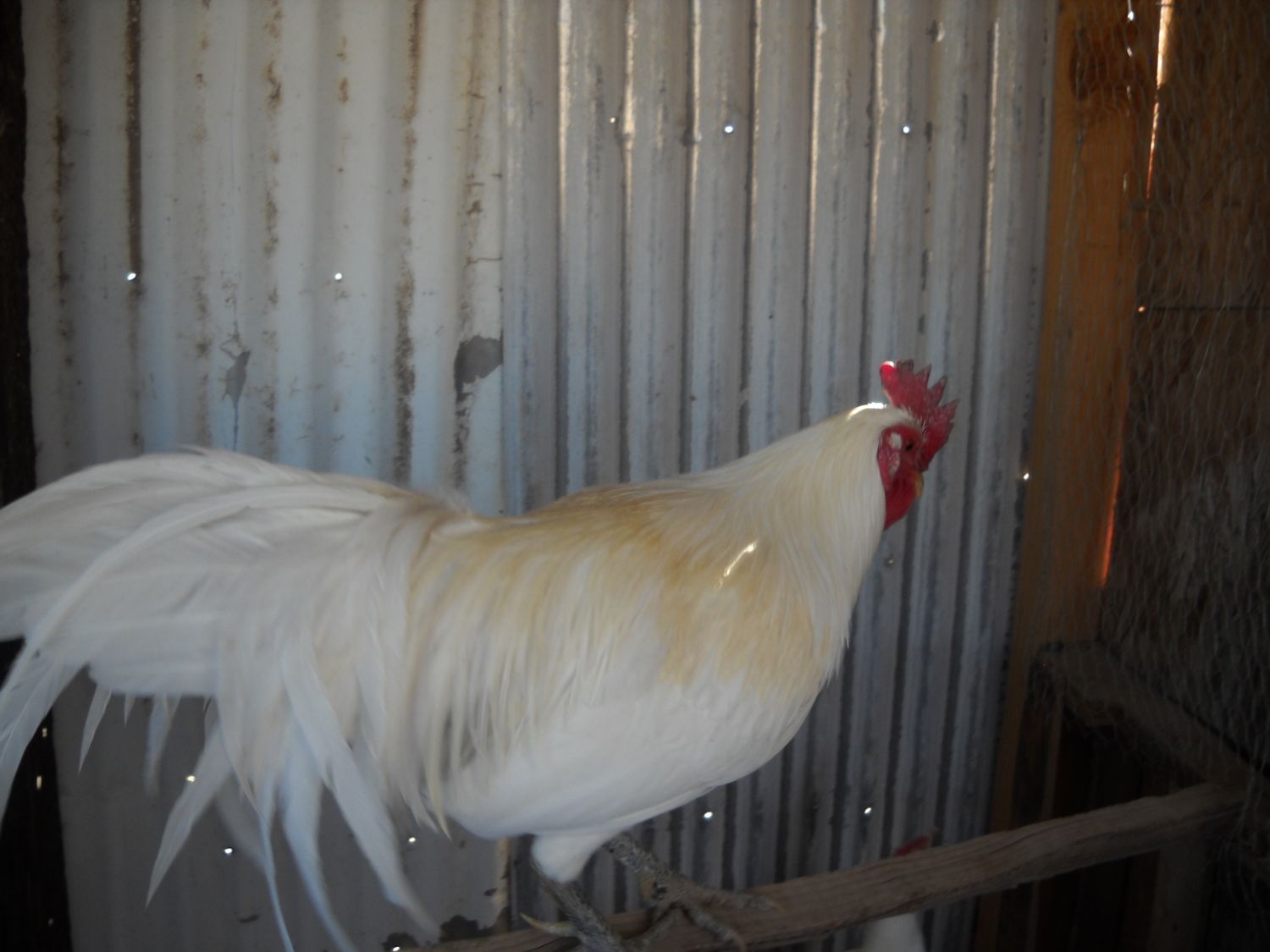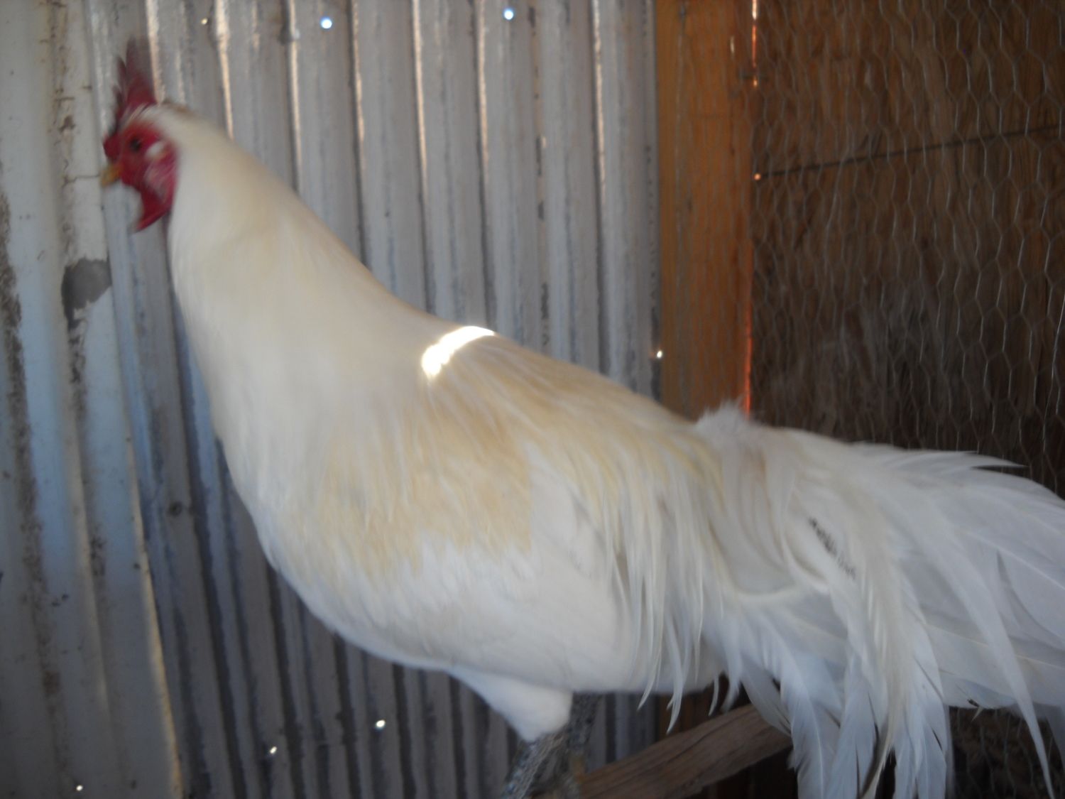Finally got a few pictures! Sorry they are not that good, but it was rather windy and freezing cold, so I was in a little bit of a rush. Not only that, the birds are still a bit shy when I come as I haven't had them very long. Here is a pic of the female. It's a little blurry because she suddenly turned to jump down as I took the picture. Here is my big boy (not that he is that big). Keep in mind, the lady I acquired them from gave them to me because she could not house him with her other roos. He got pretty beat up. A decent picture of the two of them together. The yellow in their feathers confuses me. I'm sure its the sun that turned them yellow, but sometimes I think otherwise. Just another snapshot of the roo. The male is about 2 years old, and the female is about 6 months older than he is. I really am having a hard time telling whether the blonde is from the sun discoloring the white feathers (my brother's polish have had this happen to them, so I've seen it happen) or whether there is actual blonde/gold in the bloodline. Anyways, I'm excited to have my first pair of Phoenix :) I would hope I could get some silver out of them, but if not, that's okay. These are beautiful birds.