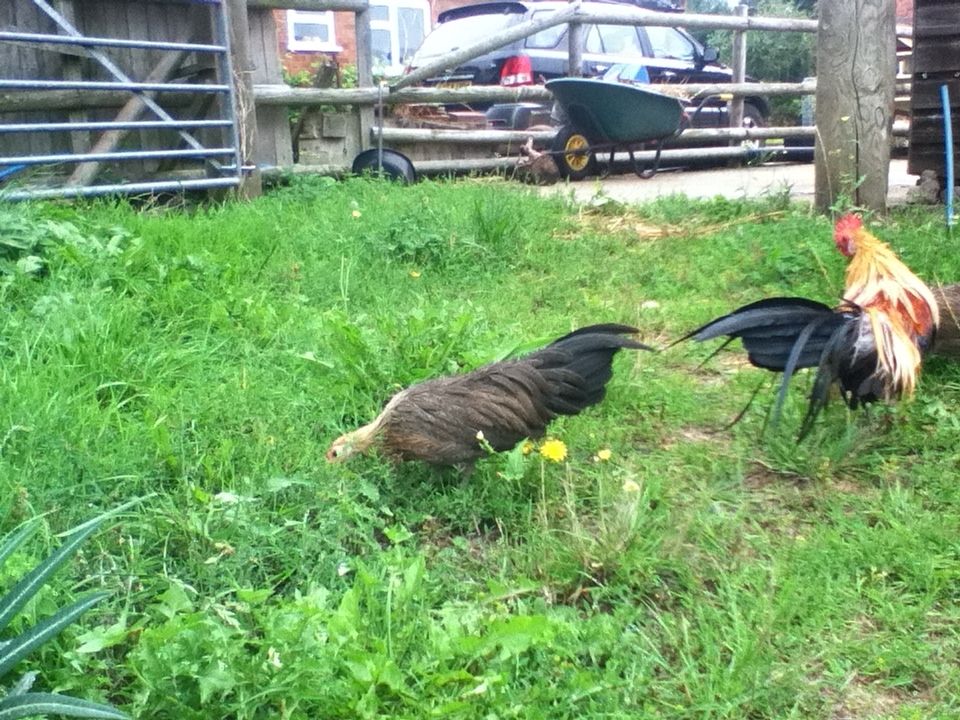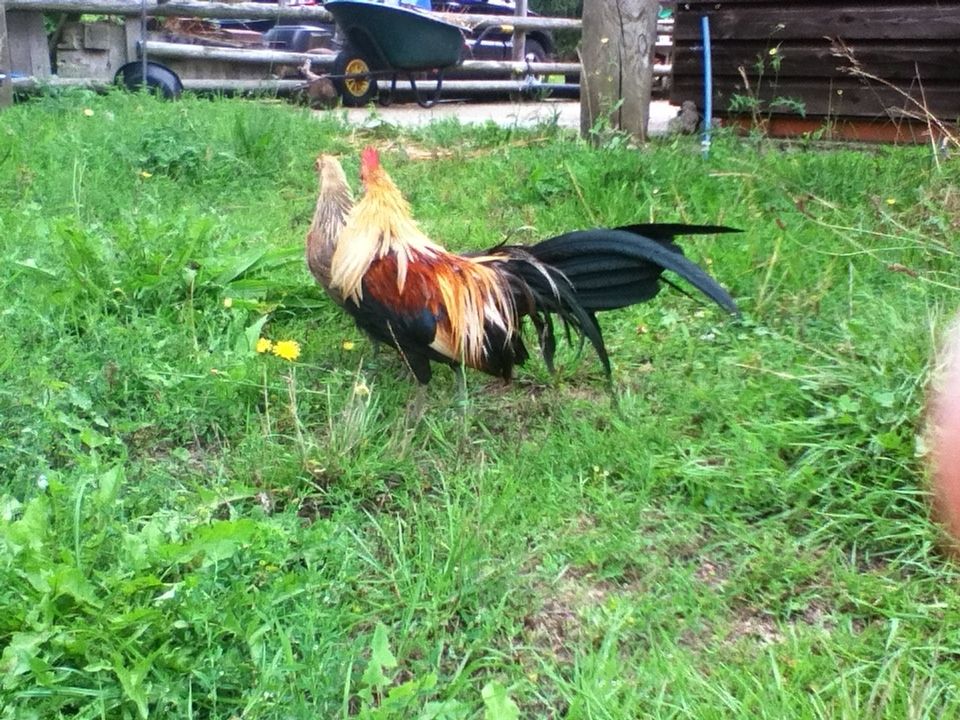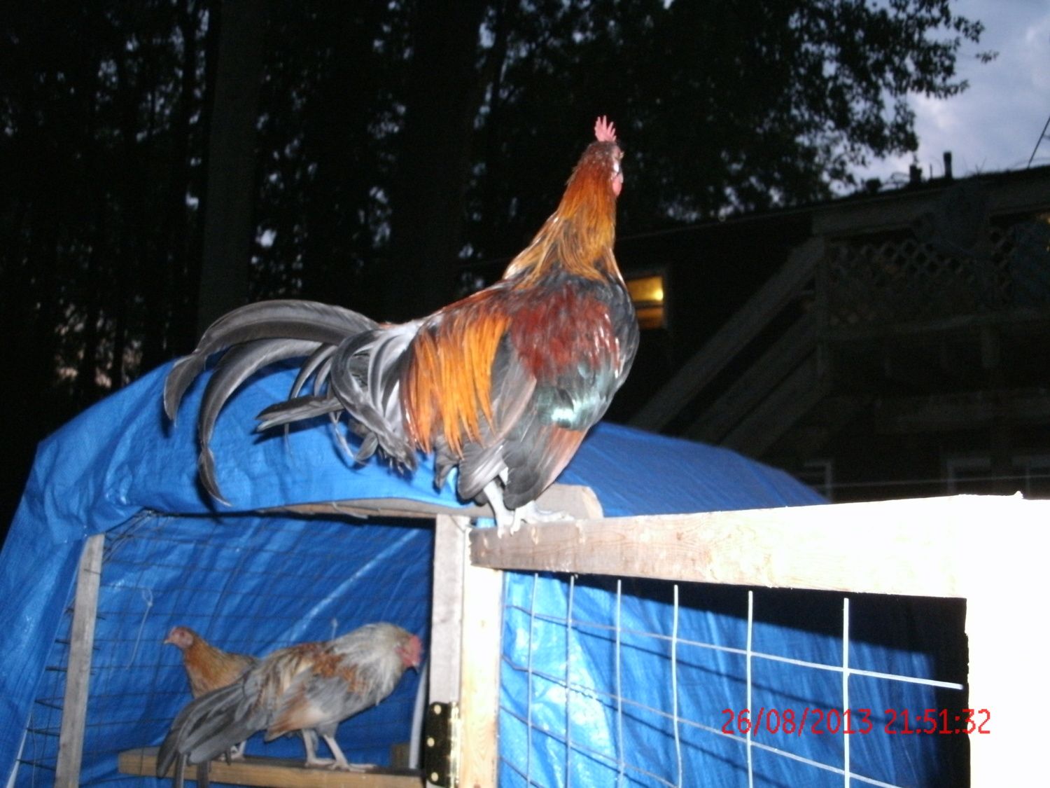 Mr. Ed, the BB is a tad smaller than the blue. Also, in the first pic, Mr. Eds wings are low, but that's because it was freaking 80 degrees at 9 pm... The weather went from nice to hot in 2 days. It's miserable out there right now. All my birds are walking around with their wings out.The Blue Boy has a longer tail at this point, and his hackles and saddles make me dizzy. Not sure exactly any more what his color should be. I thought at first he was a lemon blue, but he's got what I think is consider crele... the barring?... Anyway. Both are very good and it's time to put them in a bachelor pad... Bummer, but want those tails to grow. Now... can I put them in a bachelor pad by together, or should it be so they are together, but can't fight? They are starting to get frisky with the pullets... Both my golden pullets are gone. I have only one bbr and one lemon blue. OH, that last picture, that is the first time in the few years that I have had chickens that I was able to get a pic of a bird in flight. He was jumping back up to get on the roost. So cool.