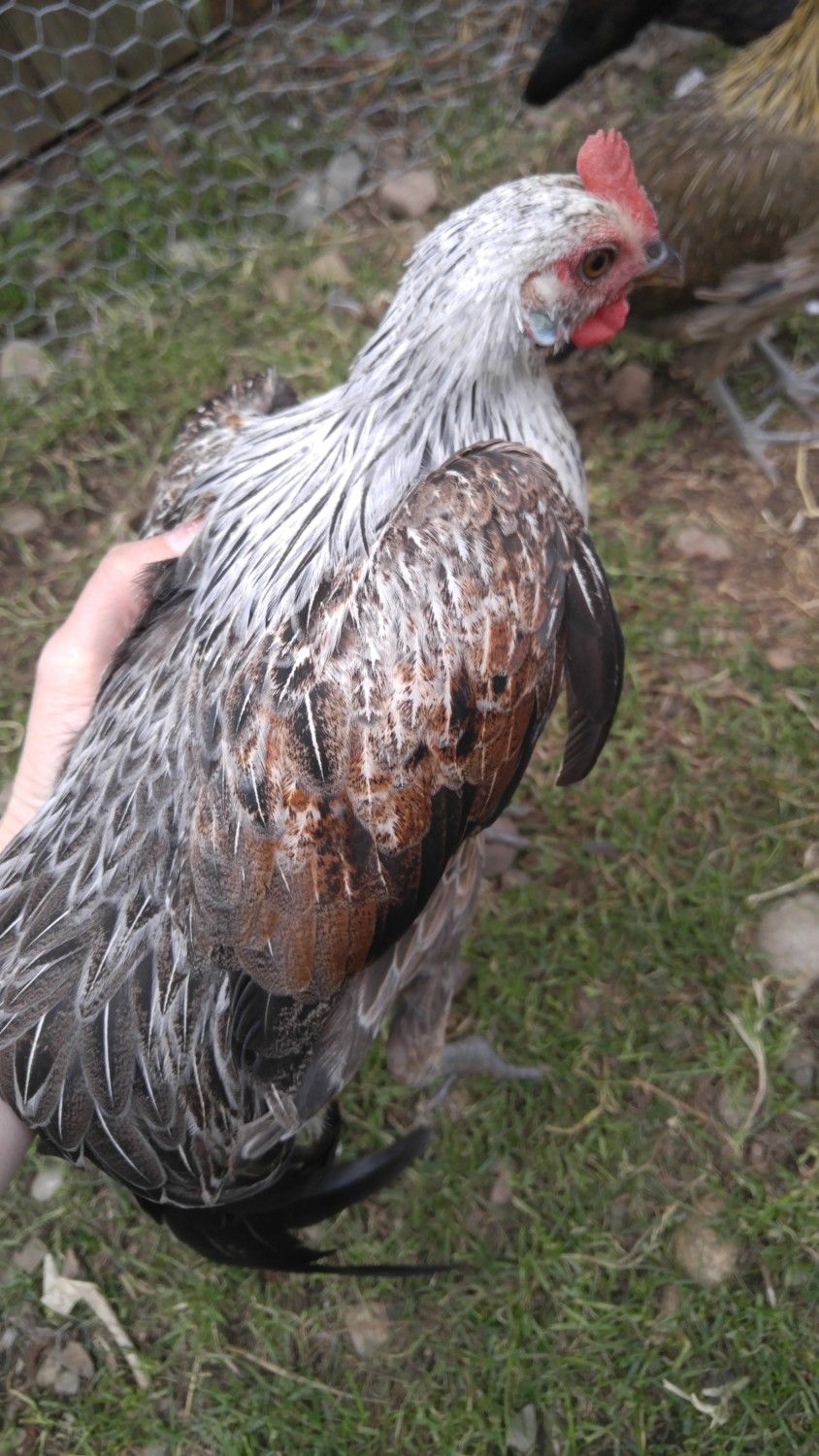 silver laced phoenix project. 4 months old and tails coming in nice, couldn't get them to turn to show tails but you can see the lacing going well