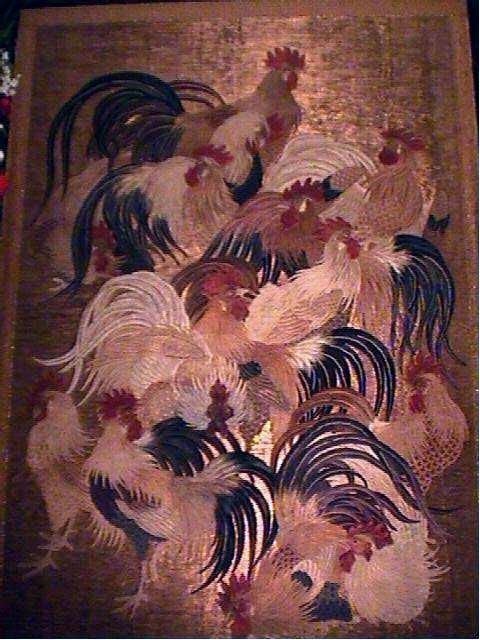 Thank you ! I bought that tapestry over the net in 2000. When it arrived, I unrolled it on my living room floor. Yikes ! If I had sneezed, those wonderful cockerel faces would have been gone. The silk had turned to frayed pieces as silk will. I turned off the AC to that room, and locked the doors to give myself time to think. How to save it ????? Sometime that night a plan hatched in my sleeping brain. The upshot was that I spent 3 months on my knees with a watercolor brush aligning those shredded fibers.The gold wrapped background was a mess, as some nut had glued whole areas of loose threads.I won't tell you what I used to adhere those silk fibers, but it was very tedious work. At the time of arrival, the tapestry was 5 feet by 10 feet long. I had to shorten it 6" to salvage some threads. Finally, after another 3 months of work, I made a stretcher for it, and was able to slide the tapestry on it, and put it on my dining room table. What a relief to my back ! The old Obi border was a total loss, so I used wide gold silk ribbon for the border. My wonderful frame guy found museum acrylic for the frame, and 4 of us got it under cover at last. I was so thrilled to have saved this piece, as it was not made for export. It is late Edo period, or very early Meiji Japanese. That makes it at least 150-200 years old.The detail is truly amazing.Wonderful padded embroidery, and string technique, used by people who knew and valued chickens. When I later sent photos of it to the sellers, they told me that they had taken it to 3 "restorers" on the West Coast , all of whom had told them it was not salvageable. Here it is. More detail photos on my page.......
