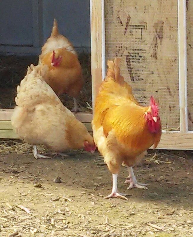 A month later, when we got four wether Nigerian Dwarf Goats, I bought two of their 1 year old Buff Orpington hens and got a Buff Roo (CoCo) for free.![]()
