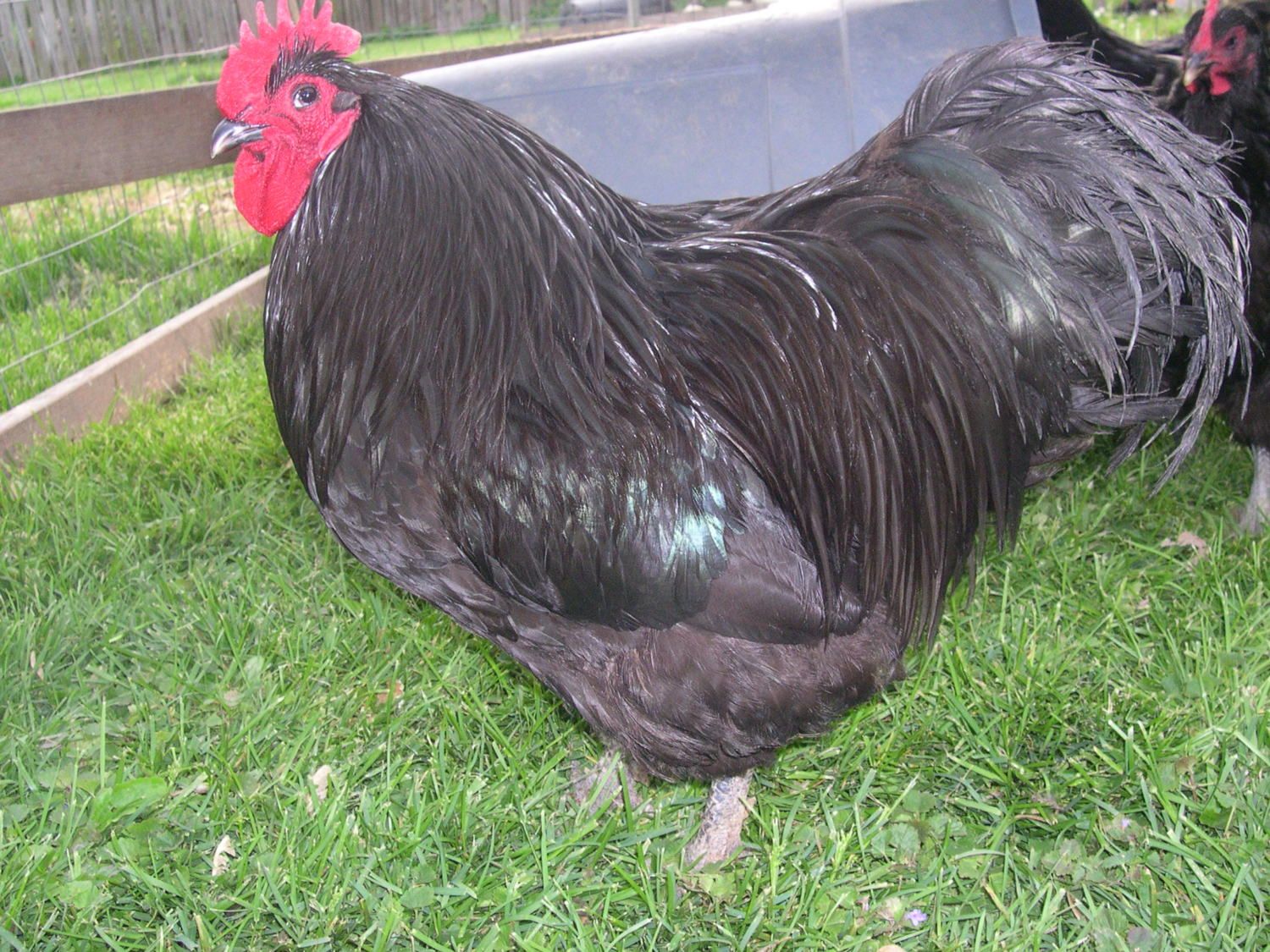Thanks for your thoughts on him, and I really hope he continues to fill out. He's a big boy for 6 mos old. That's him in the background, I have no idea how the angle I took it with made him look so small. LOL. We had trouble fitting him in and out of the cage doors. His tail angle does look a little low most of the time now that I'm looking at it. But he's a very relaxed boy, and when he is strutting around the yard with the girls, he holds it up higher. I'm not sure what to think of that. He's just lazy maybe?Oh, here are some better pics I got of him.