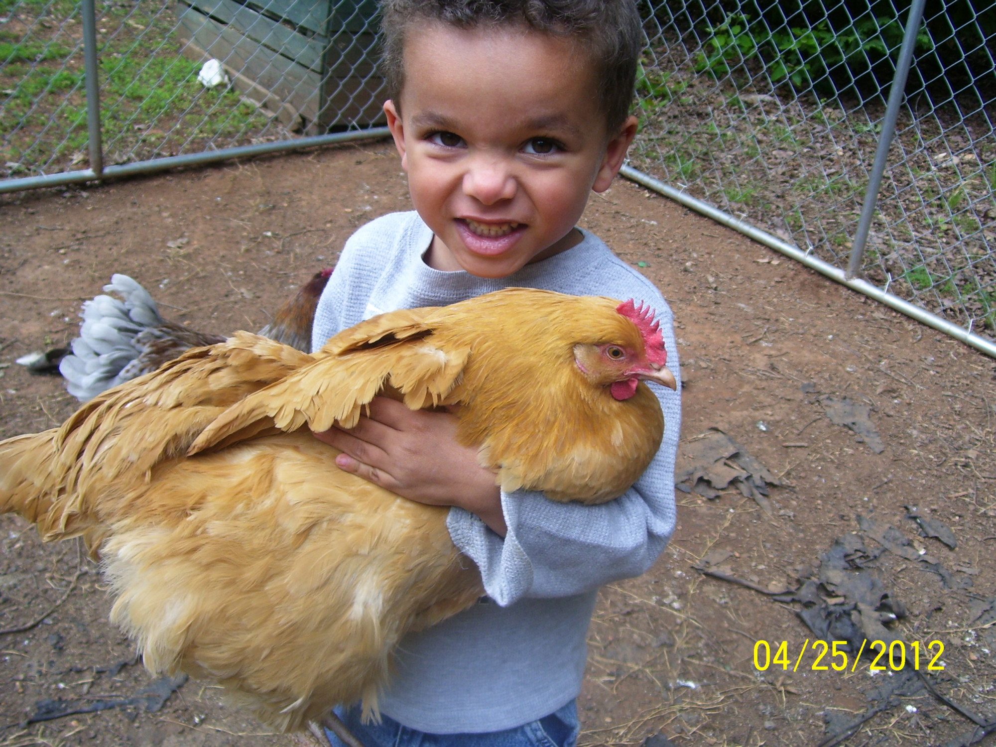 thats quite a handful for that little guy...he looks like hes lovin every minute of chicken keeping...