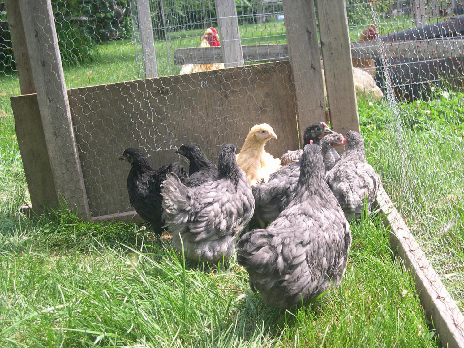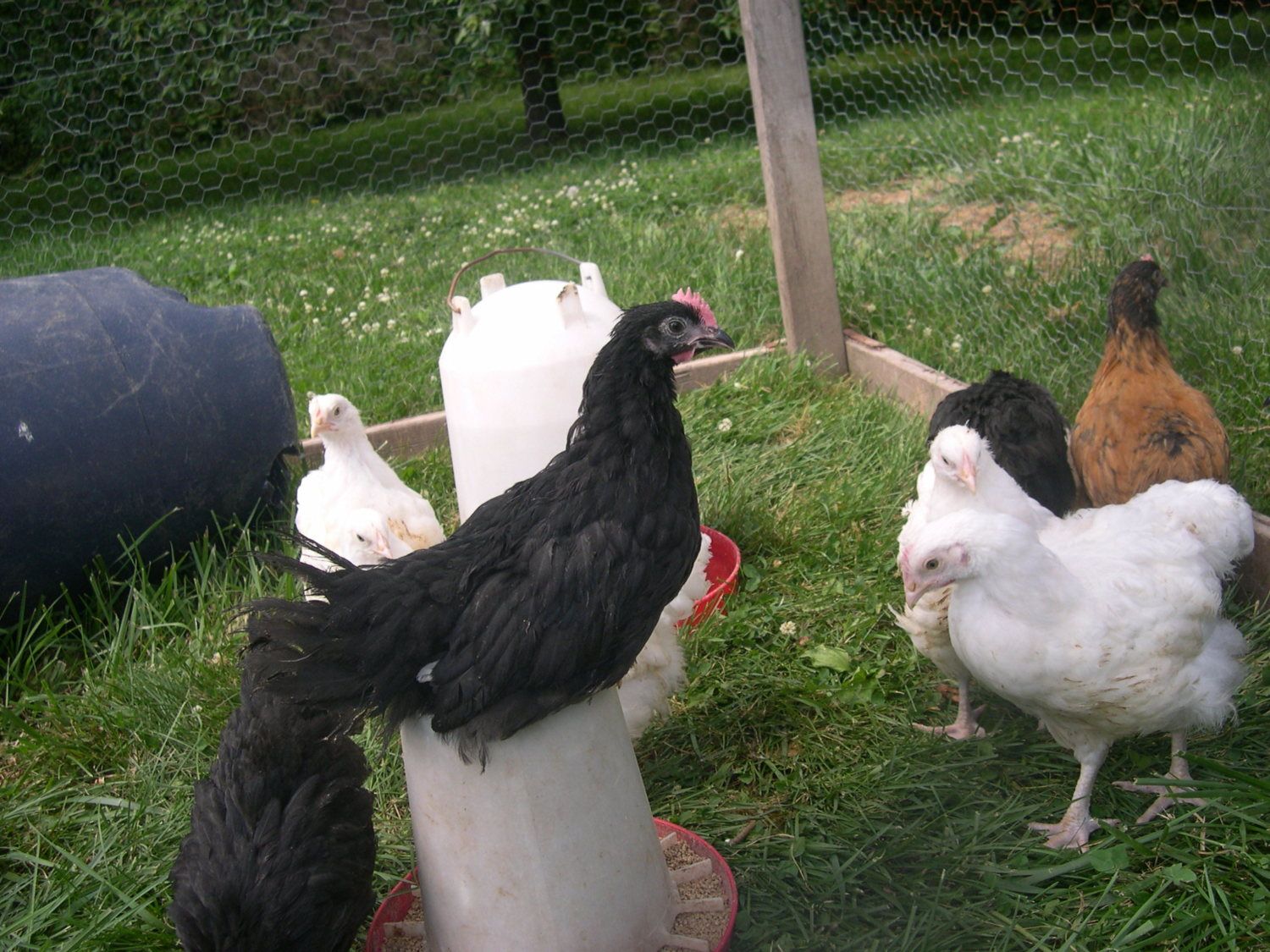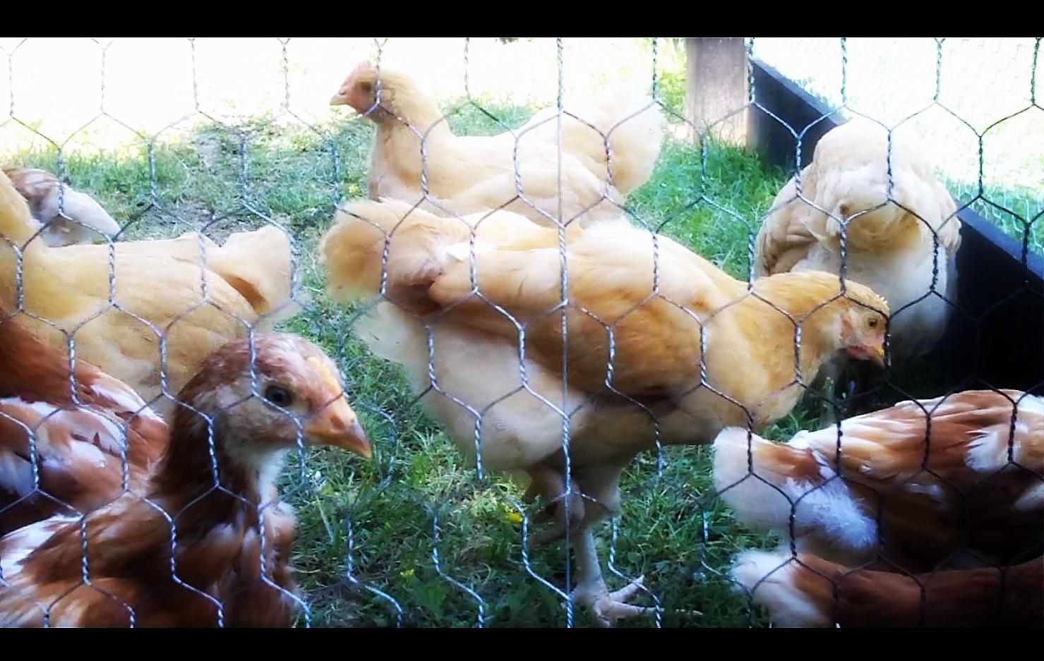 Here are my two......boys?? They are 14 weeks old. Fred got his comb & waddle first, and had huge shanks, but Fiona just got bigger than him last week, her comb isn't as red as his though. How much longer until they crow? I haven't caught either of them trying yet. They are inbetween the peep and crow stage - kinda like a teenager. Fred is on the left, Fiona (Frank?) on the right.