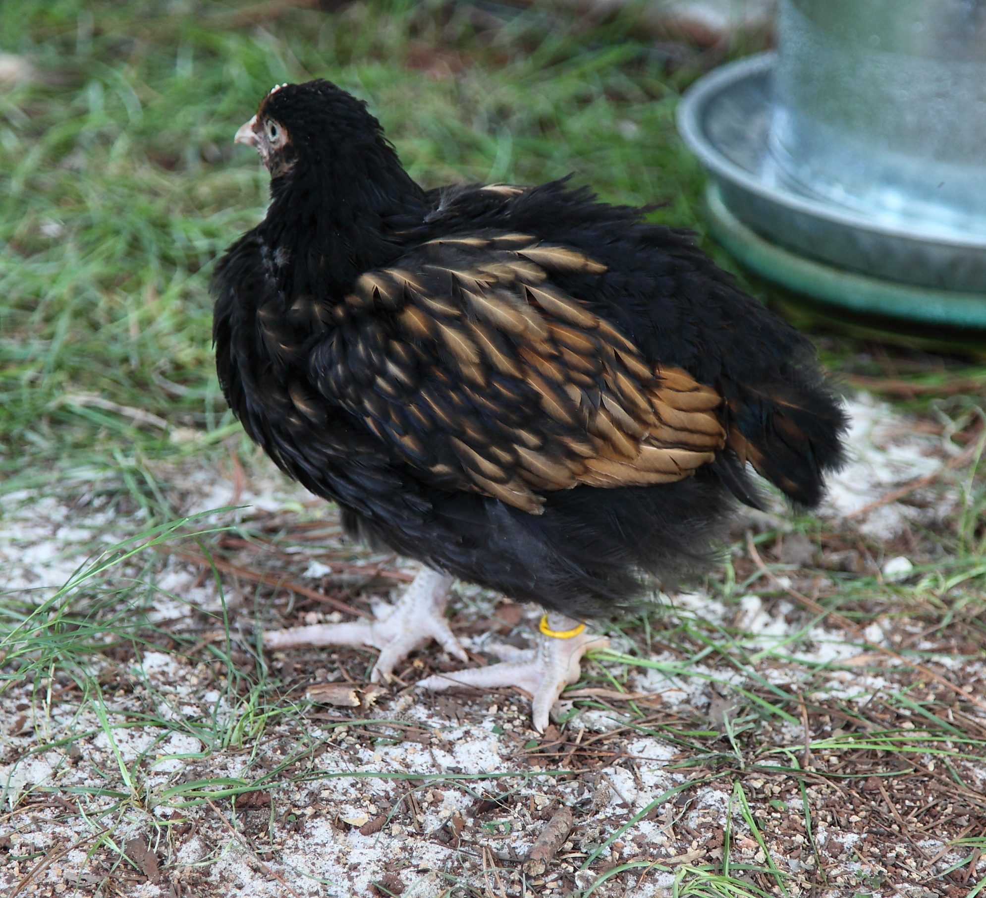 Last night we banded the chicken nuggets again and they are in size 10 leg spirals! Pretty big feet for six weeks. Below is Left yellow. He weighed in at 1 lb 13 oz. He is the sweetest and yet keeps everyone in line.![]()