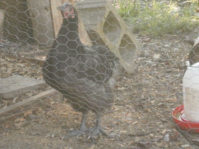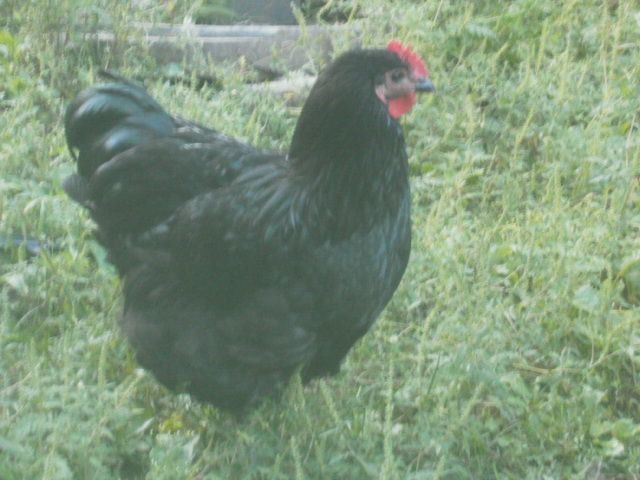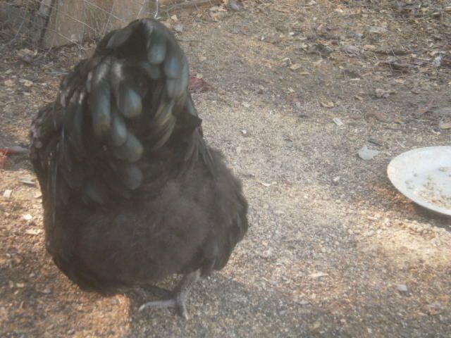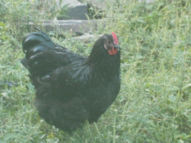 The plumage of Orps is important in order to maintain the ideal type/shape of the breed. The feathers should be broad and smooth fitting on the deep body of this breed. The appearance of massiveness should not be achieved by developing extreme length of feathers in the plumage. (this is what appears to be going on in the tail of the Dave K pic...long stringy feathers.) The sides of the body (fluff area) should be comparatively straight with full but not profuse feathering. You should be able to see the profile of the hock.