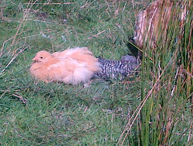 A REALLY bad day here...We had some nice poultry folks visit this morning to see the buffs.Then Buddy and I went to the feedstore. We were gone for 45 minutes. All the Buffs were out, as they are every day. Came home, and decided to band some of the young birds. Got to the main coop and orchard, and did not see a bird. Something very wrong. The upshot is that I am missing my newly shipped English Buff Orp. K from Marc, as well as a HINKJC large pullet. I thought the cute little cochin pet of my husband's, LuLu, was gone too, but after 2 hours of searching, I found her under some ivy by a stump, scared to death. There are no feathers in the yard, and no signs of any kind of a hawk strike. My property is surrounded by an 8' wood fence with wire into the ground. My 4 dogs patrol the property. I cannot believe that this was a hawk or coyote strike. I think a 2 legged strike. Please keep an eye, and ear, open for my birds. The K was about 10-12 weeks old. The pullet was14 weeks. I can't believe that hawks could, or would, select a breeding pair, and nail them in 45 minutes. Somebody had to have been watching this place as we have no set schedule.